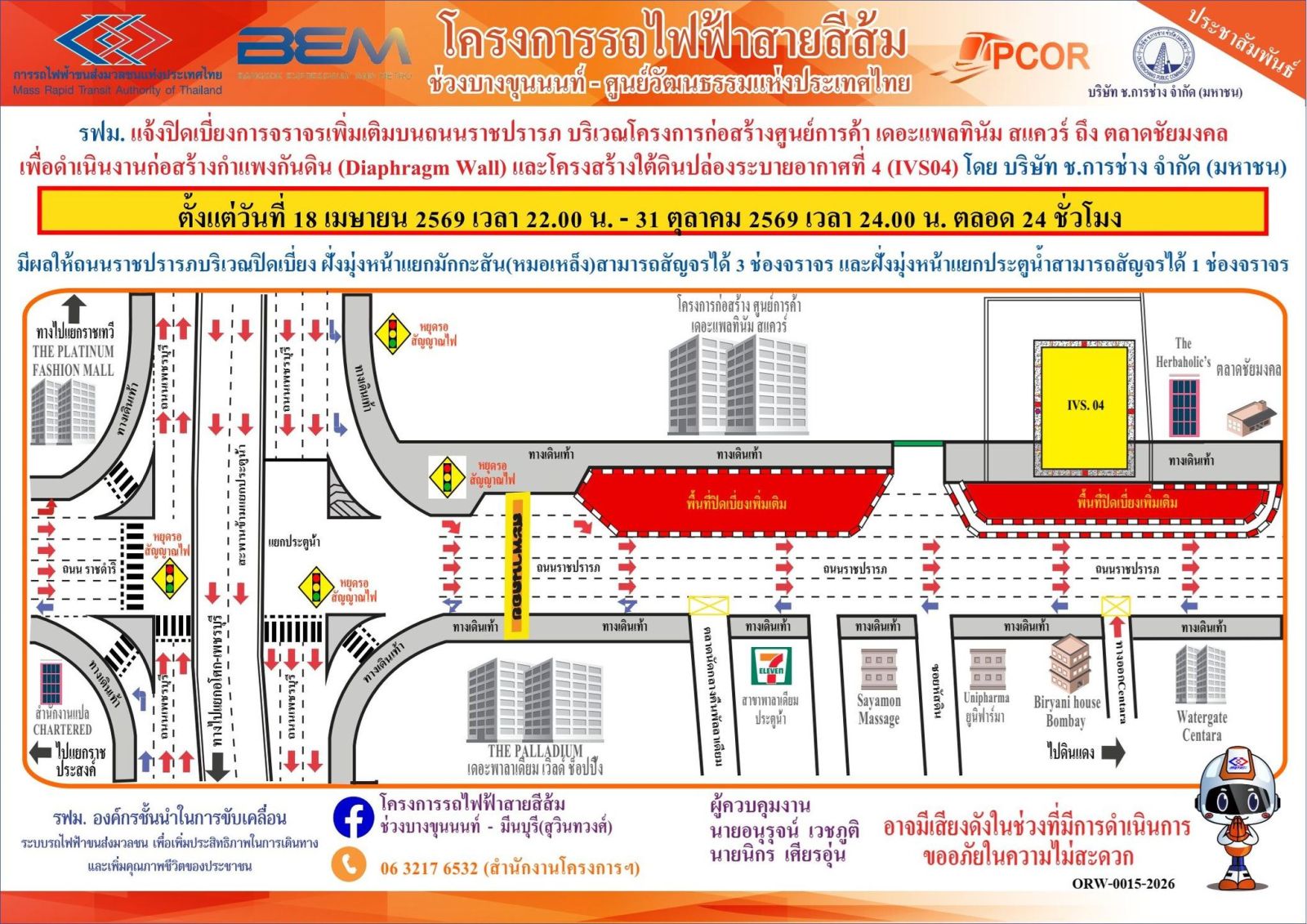 รฟม. แจ้งปิดเบี่ยงการจราจรเพิ่มเติมบนถนนราชปรารภ บริเวณโครงการก่อสร้างศูนย์การค้า เดอะแพลทินัม สแควร์ ถึง ตลาดชัยมงคล เพื่อดำเนินงานก่อสร้างกำแพงกันดิน (Diaphragm Wall) และโครงสร้างใต้ดินปล่องระบายอากาศที่ 4 (IVS04) โครงการรถไฟฟ้าสายสีส้ม ช่วงบางขุนนนท์ - ศูนย์วัฒนธรรมแห่งประเทศไทย ตั้งแต่วันที่ 18 เมษายน 2569 เวลา 22.00 น. – 31 ตุลาคม 2569 เวลา 24.00 น. ตลอด 24 ชั่วโมง