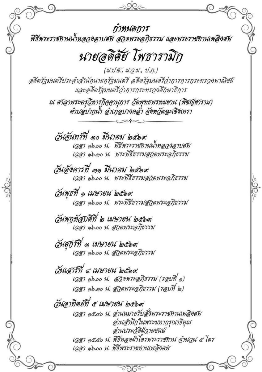 30 มีนาคม 2569 ผู้สื่อข่าวรายงานว่า พิชญ์ โพธารามิก ลูกชายของ นายอดิศัย โพธารามิก อดีตรัฐมนตรีว่าการกระทรวงศึกษาธิการ (ศธ.) โพสต์ข้อความผ่านเฟซบุ๊ก Pete Bodharamik ความว่า 7.28 am : 28 มีนาคม 2569 คุณพ่อ จากไป อย่างสงบ ทุกคำสอน ทุกคำสั่งเสีย จะนำไปดำเนินการ ให้เรียบร้อยครับ พร้อมกับแนบกำหนดการ พีธีพระราชทานน้ำหลวงอาบศพ