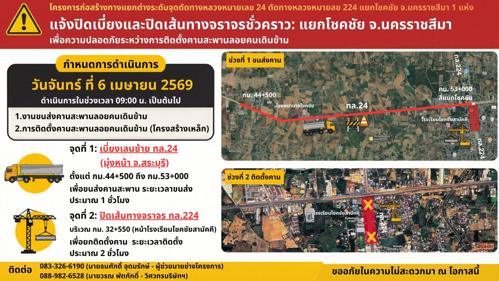 แจ้งเตือนผู้ใช้รถใช้ถนน! ปิดเบี่ยงและปิดเส้นทางจราจรชั่วคราว บริเวณแยกโชคชัย จ.นครราชสีมา เพื่อความปลอดภัยในระหว่างการดำเนินงานขนส่งและติดตั้งคานสะพานลอยคนเดินข้าม (โครงสร้างเหล็ก) ในโครงการก่อสร้างทางแยกต่างระดับจุดตัด ทางหลวงหมายเลข 24 ตัดทางหลวงหมายเลข 224 (แยกโชคชัย) จ.นครราชสีมา 1 แห่ง ขอแจ้งเบี่ยงและปิดการจราจรชั่วคราวดังนี้