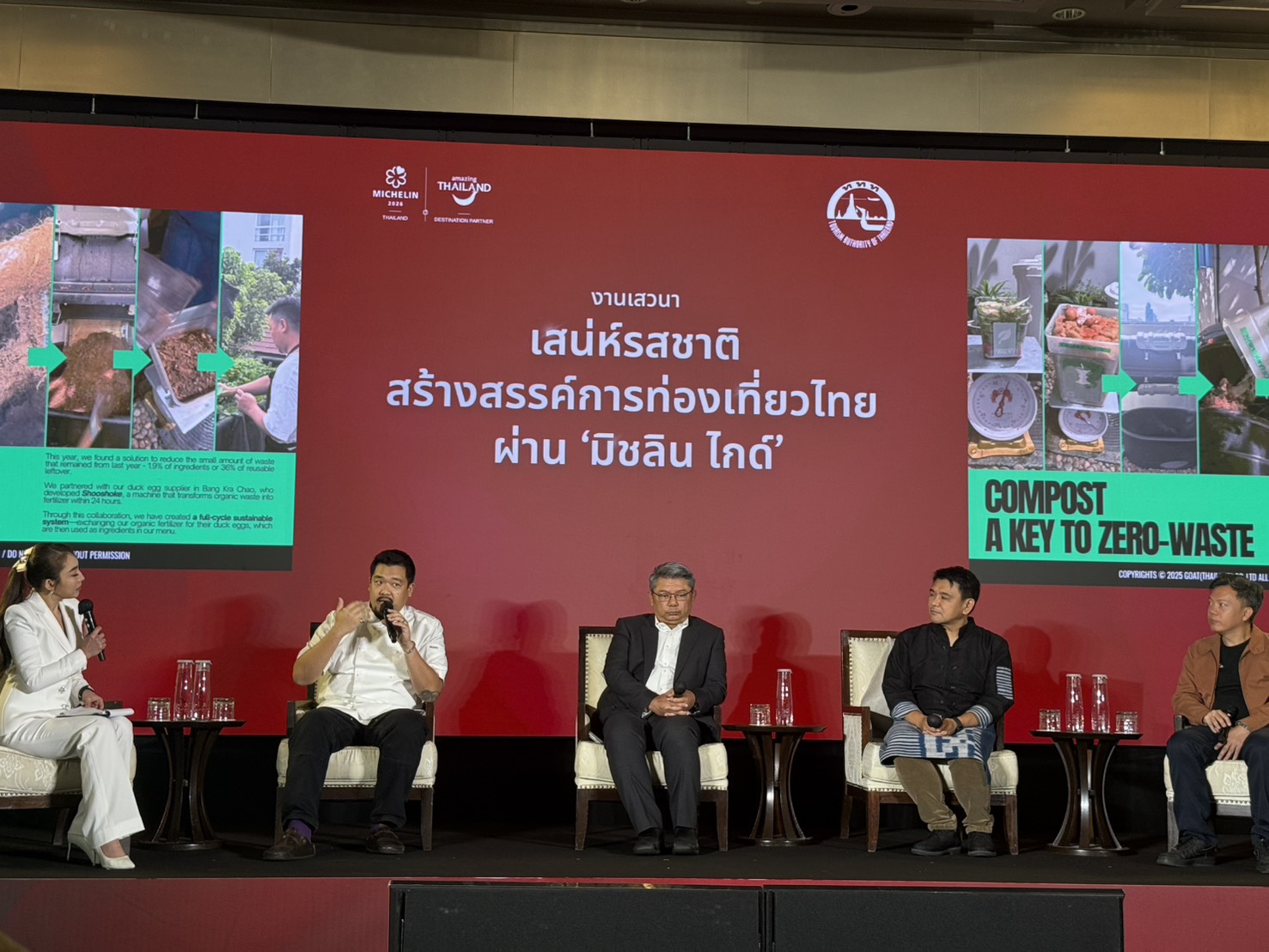ภายในงานเสวนาดังกล่าว ททท. ในฐานะพันธมิตรเชิงยุทธศาสตร์ของ ‘มิชลิน ไกด์’ มานานกว่า 9 ปี ได้เชิญบุคลากรจากร้านอาหารในคู่มือ ‘มิชลิน ไกด์’ ฉบับประเทศไทย ประจำปี 2569 มาร่วมพูดคุยและแสดงความคิดเห็นบนเวทีเสวนา ได้แก่ นิธี สีแพร รองผู้ว่าการด้านสื่อสารการตลาด การท่องเที่ยวแห่งประเทศไทย, เชฟ “แทน” ภากร โกสิยพงษ์ จาก ‘โกท’ ร้านอาหารรางวัล ‘หนึ่งดาวมิชลิน’ และ ‘ดาวมิชลิน รักษ์โลก’, เชฟ “โก๋” ไพศาล ชีวินศิริวัฒน์ จาก ‘แก่น’ และ “กอล์ฟ” เอกรินทร์ อยู่สุขสมบูรณ์ นักออกแบบและตกแต่งอาหาร หรือ Food Stylist จาก ‘แก่นกรุง’ โดยสองร้านหลังติดอันดับร้านแนะนำ หรือ MICHELIN Selected