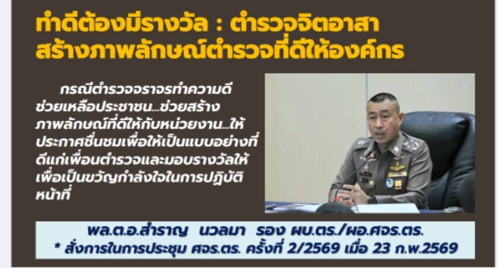 วันนี้ (30 มีนาคม 2569) เวลา 16.00 น. พล.ต.อ.สำราญ นวลมา รองผู้บัญชาการตำรวจแห่งชาติ ในฐานะผู้อำนวยการศูนย์บริหารงานจราจร สำนักงานตำรวจแห่งชาติ (รอง ผบ.ตร./ผอ.ศจร.ตร.) และ พล.ต.ท.สมประสงค์ เย็นท้วม ผู้ช่วย ผบ.ตร./รอง ผอ.ศจร.ตร. มอบหมายให้ พล.ต.ท.นิธิธร จินตกานนท์ ผู้บัญชาการศึกษา ในฐานะหัวหน้าคณะทำงานฝ่ายเสริมสร้างภาพลักษณ์ตำรวจจราจร ศจร.ตร. เดินทางไปตรวจเยี่ยมและมอบรางวัลให้กับ "ส.ต.ท.พัชรพล คงคากุล" ผบ.หมู่ (จร.) สภ.นาจอมเทียน จว.ชลบุรี เพื่อชื่นชมการปฏิบัติหน้าที่ช่วยเหลือประชาชนด้วยความเสียสละ สร้างภาพลักษณ์ที่ดีให้กับองค์กรตำรวจ และเป็นแบบอย่างที่ดีให้กับเพื่อนข้าราชการตำรวจ ณ สภ.นาจอมเทียน จว.ชลบุรี โดยมี พล.ต.ต.นันทวุฒิ สุวรรณละออง รอง ผบช.ภ.2 พร้อมรองผู้บังคับการตำรวจภูธรจังหวัดชลบุรี , ผกก.สภ.นาจอมเทียน และเจ้าหน้าที่ตำรวจในสังกัด สภ.นาจอมเทียน จว.ชลบุรี ให้การต้อนรับ