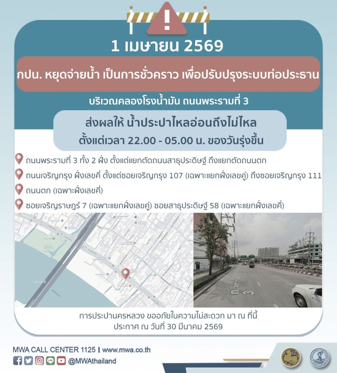 การประปานครหลวง (กปน.) ขอแจ้งให้ทราบว่า จะดำเนินการตามแผนปรับปรุงระบบท่อประธาน ในพื้นที่บริเวณคลองโรงน้ำมัน ถนนพระรามที่ 3 เพื่อให้ประชาชนได้รับบริการน้ำประปาอย่างเพียงพอและทั่วถึง จึงมีความจำเป็นต้องหยุดจ่ายน้ำ เป็นการชั่วคราว ในคืนวันพุธที่ 1 เมษายน 2569 ตั้งแต่เวลา 22.00 - 05.00 น. ของวันรุ่งขึ้น โดยระหว่างดำเนินการ ส่งผลให้ น้ำประปาไหลอ่อนถึงไม่ไหล ในพื้นที่ดังต่อไปนี้