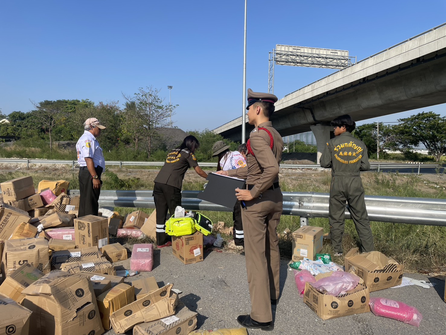 ที่เกิดเหตุพบรถยนต์ยี่ห้ออีซูซุ ตู้ทึบสีขาว ทะเบียน กรุงเทพฯ สภาพด้านหน้ามีรอยชนได้รับความเสียหาย ด้านหน้าซ้ายยุบกระจกแตก ประตูรถทั้งสองด้านเปิดออก บนถนนและข้างทางยังพบกล่องสินค้าจำนวนมาก จำพวกน้ำยาปรับผ้านุ่ม แป้ง และนม กระจัดกระจายเกลื่อนถนน นอกราวเหล็กกั้นถนนในพงหญ้าพบร่าง ชาย อายุ 39 ปี เป็นพนักงานติดรถคันดังกล่าว นอนเสียชีวิตอยู่ข้าง