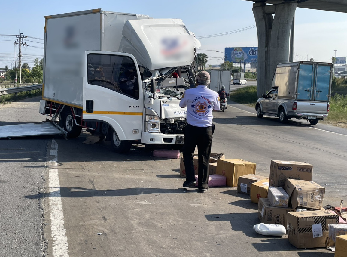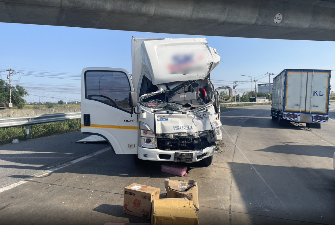 ด้าน คนขับรถบรรทุกสินค้า อายุ 50 ปี กล่าวว่า ตนขับรถมารับสินค้าเพื่อจะไปส่งที่คลังสินค้า ที่คลองสุวรรณภูมิ จ.สมุทรปราการ เมื่อมาถึงที่เกิดเหตุตนได้หลับในทำให้รถไปชนกับราวเหล็กกั้นถนนจนรถหมุน ส่วนผู้เสียชีวิตเป็นญาติกันเป็นเด็กติดรถนั่งมาด้านหน้าซ้าย ได้กระเด็นออกจากตัวรถไปเสียชีวิตอยู่ข้างทาง เขาก็คาดเข็มขัดแต่คงจะล็อคไม่แน่น ทำให้กระเด็นออกจากรถไป ซึ่งตนก็ขับมาไม่เร็วเพราะเป็นช่วงทางโค้ง