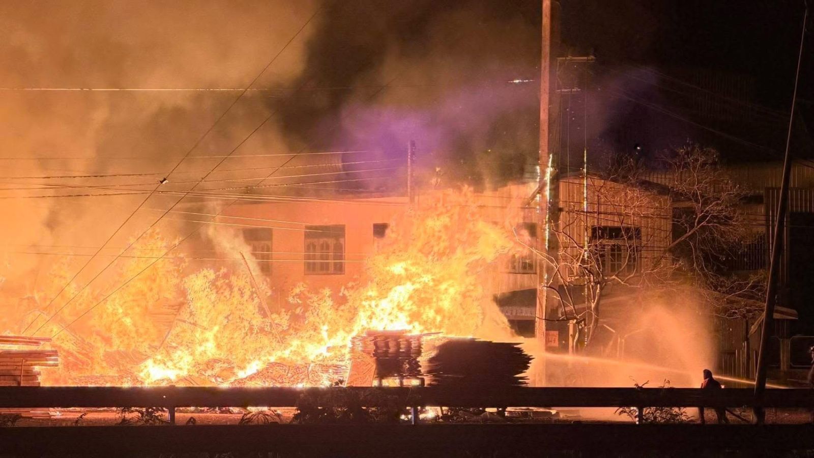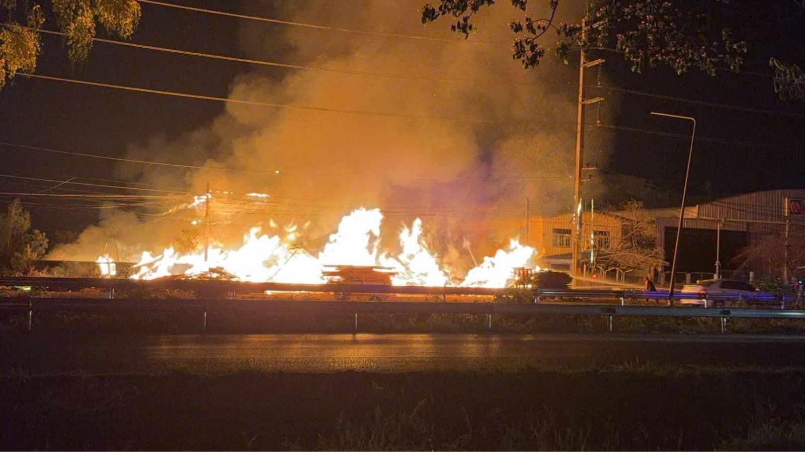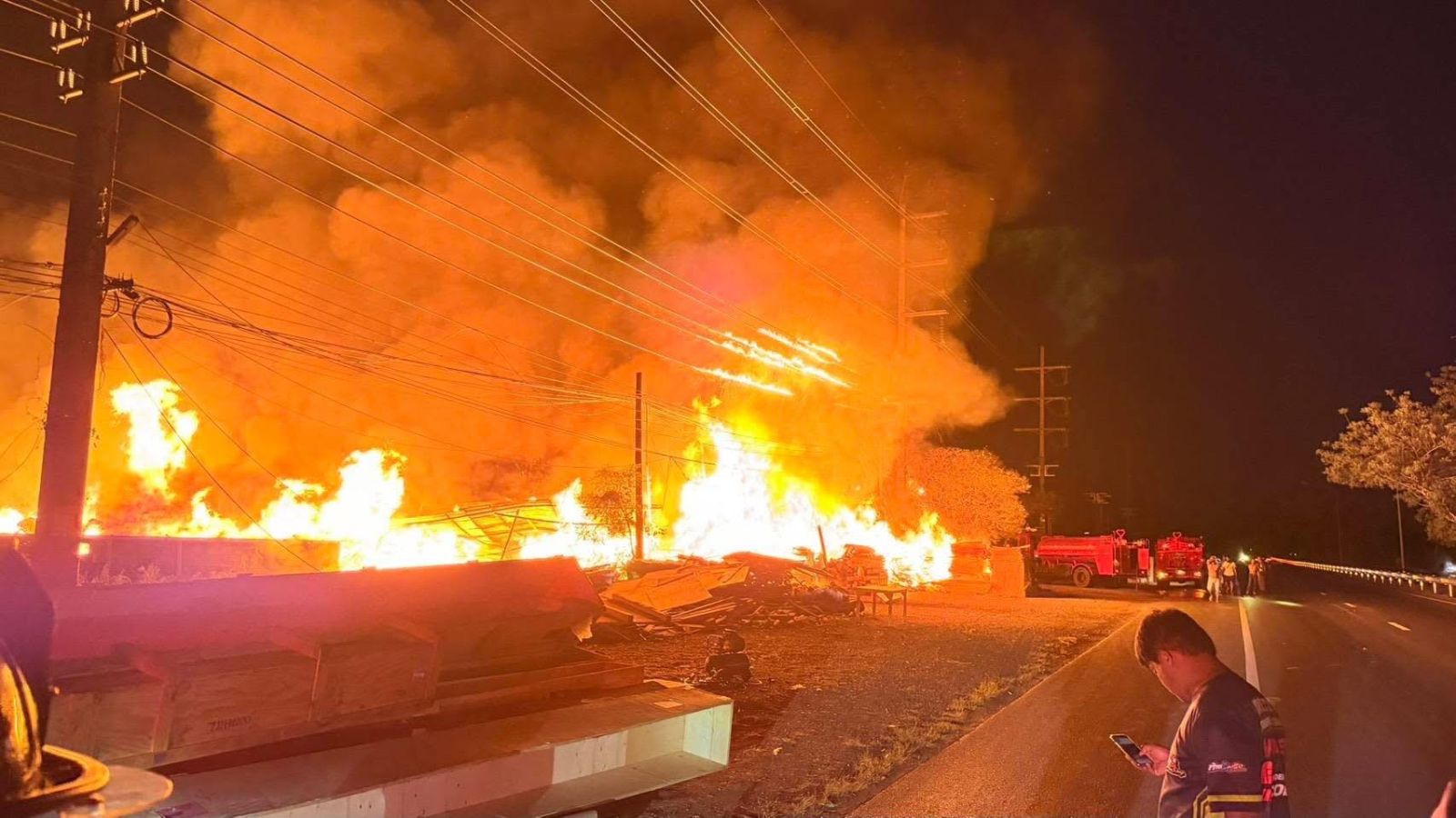 ไฟไหม้กองไม้พาเลท ริมถนนทางหลวงหมายเลข 304 ในพื้นที่กบินทร์บุรี เจ้าหน้าที่พร้อมรถดับเพลิงเร่งระดมฉีดน้ำ จ.ปราจีนบุรี