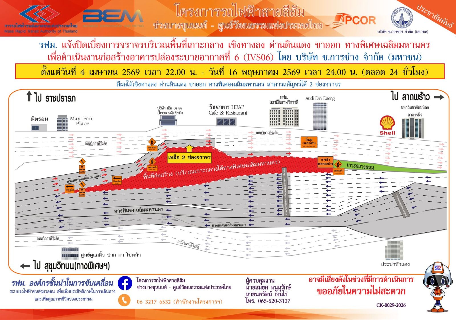 ประชาสัมพันธ์แจ้งปิดเบี่ยงการจราจรบริเวณพื้นที่เกาะกลาง เชิงทางลงด่านดินแดงขาออก ทางพิเศษเฉลิมมหานคร เพื่อดำเนินการก่อสร้างอาคารปล่องระบายอากาศ 6 (IVS06)