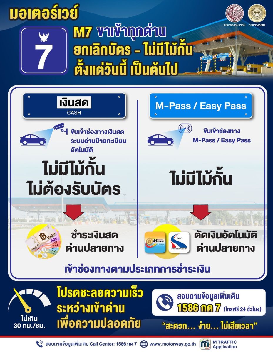 กรมทางหลวง โดยกองทางหลวงพิเศษระหว่างเมือง ประกาศนำเทคโนโลยีอ่านป้ายทะเบียนรถอัตโนมัติ (ALPR - Automatic License Plate Recognition) มาใช้เต็มรูปแบบ โดย ช่องทางเข้าด่านทุกจุด "ไม่มีไม้กั้นและยกเลิกแจกบัตรผ่านทาง" บน มอเตอร์เวย์ M7 สายกรุงเทพฯ – ชลบุรี – พัทยา – มาบตาพุด เพื่อเพิ่มประสิทธิภาพการให้บริการ ให้สะดวกและรวดเร็วในการเดินทาง ลดปัญหาการจราจรติดขัดสะสมบริเวณหน้าด่านให้ดียิ่งขึ้น