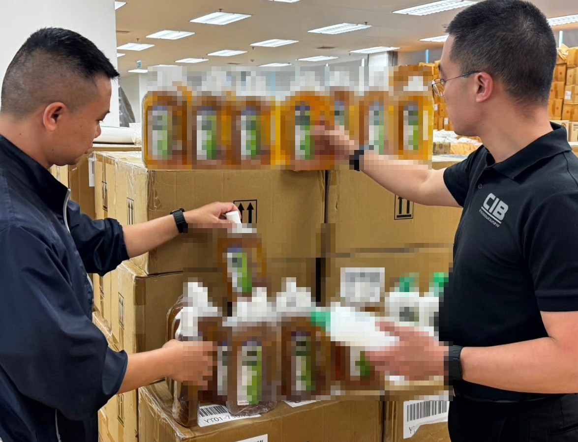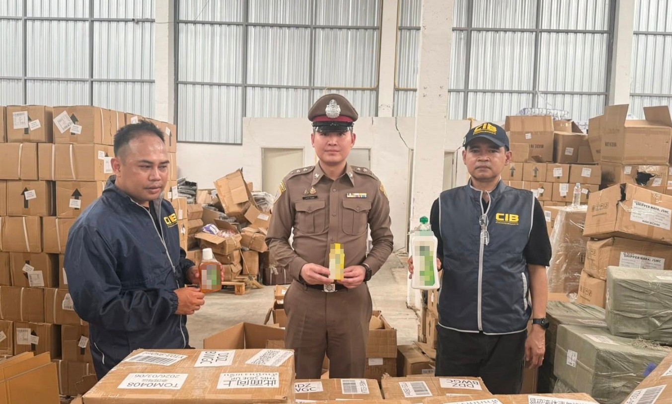 ตำรวจสอบสวนกลาง (CIB) บุกค้นโกดังขนาดใหญ่ย่านบางพลี กักเก็บสินค้าปลอม น้ำยาฆ่าเชื้อยี่ห้อดัง ขายเกลื่อนออนไลน์ ของกลางกว่าหมื่นชิ้น