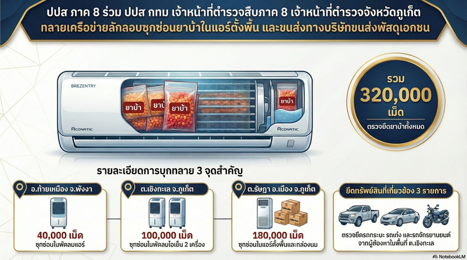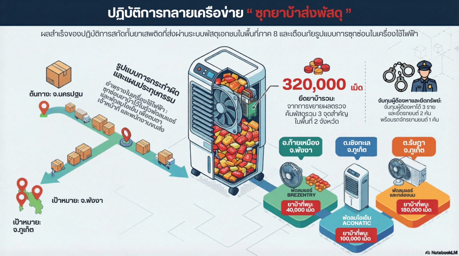 จังหวัดพังงา ตรวจยึดยาบ้า 40,000 เม็ด จากพัสดุที่ซุกซ่อนในพัดลมแอร์ พร้อมจับกุมผู้ต้องหา