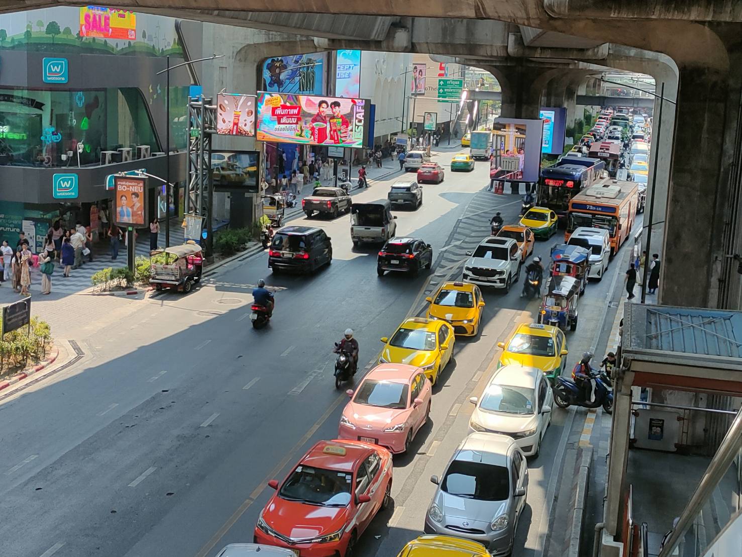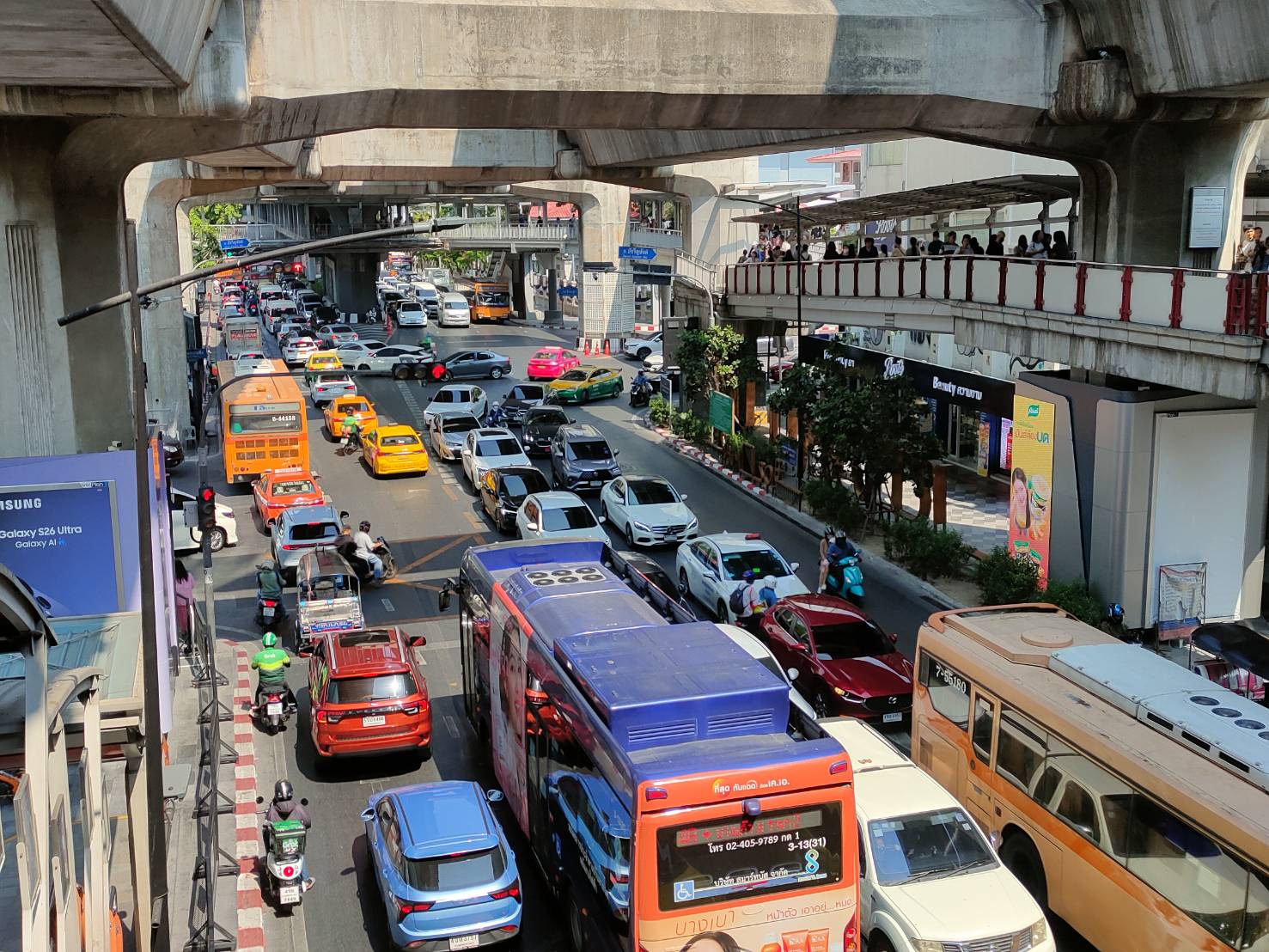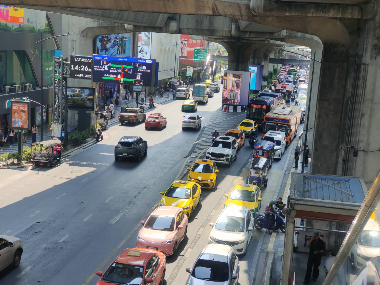 วันที่ 4 เมษายน 2569 เวลา 14.35 น. สภาพการจราจรบริเวณถนนพระราม 1 ทิศทางจากแยกเฉลิมเผ่า มุ่งหน้าแยกราชประสงค์ การจราจรติดขัดเต็มพื้นที่ รถเคลื่อนตัวช้าสลับหยุดนิ่ง ส่งผลกระทบเข้าแยกปทุมวันและแยกเจริญผล