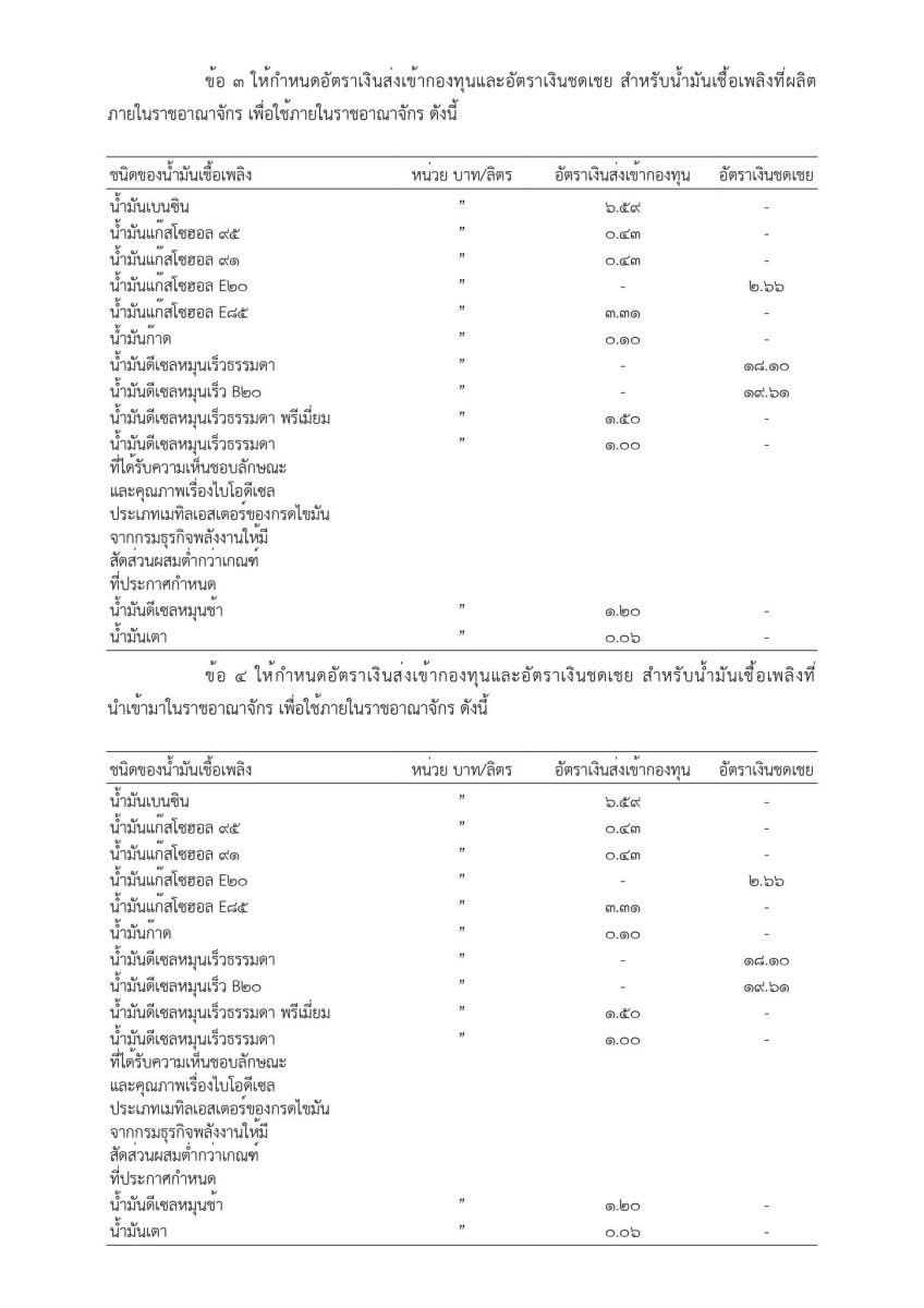 นอกจากนี้ สำนักงานกองทุนน้ำมันเชื้อเพลิง ได้ออกประกาศคณะกรรมการบริหารกองทุนน้ำมันเชื้อเพลิง ฉบับที่ 41 พ.ศ.2569 เรื่อง การกำหนดอัตราเงินส่งเข้ากองทุน อัตราเงินชดเชย อัตราเงินคืนจากกองทุนและอัตราเงินชดเชยคืนกองทุนสำหรับน้ำมันเชื้อเพลิง ประกาศ ณ วันที่ 4 เมษายน 2569