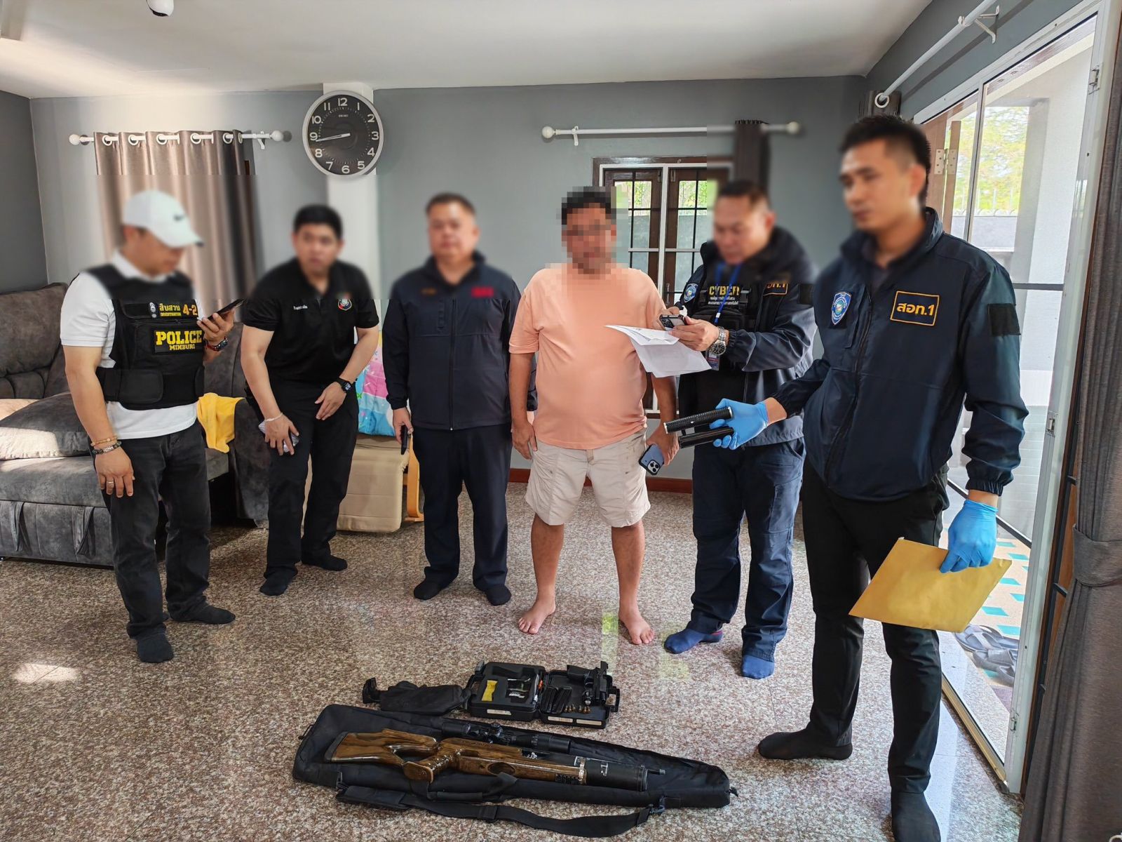 สามารถจับกุมนายออ (นามสมมุติ) อายุ 48 ปี พร้อมด้วยของกลางเป็น อาวุธปืนยาวไทยประดิษฐ์ จำนวน 1 กระบอก, ท่อลดเสียง (silencer) จำนวน 2 ชิ้น, อาวุธปืนพกสั้น Sig Sauer p320 จำนวน 1 กระบอก พร้อมแมกกาซีน จำนวน 2 ซอง และกระสุนปืนขนาด 9 มม. จำนวน 6 นัด