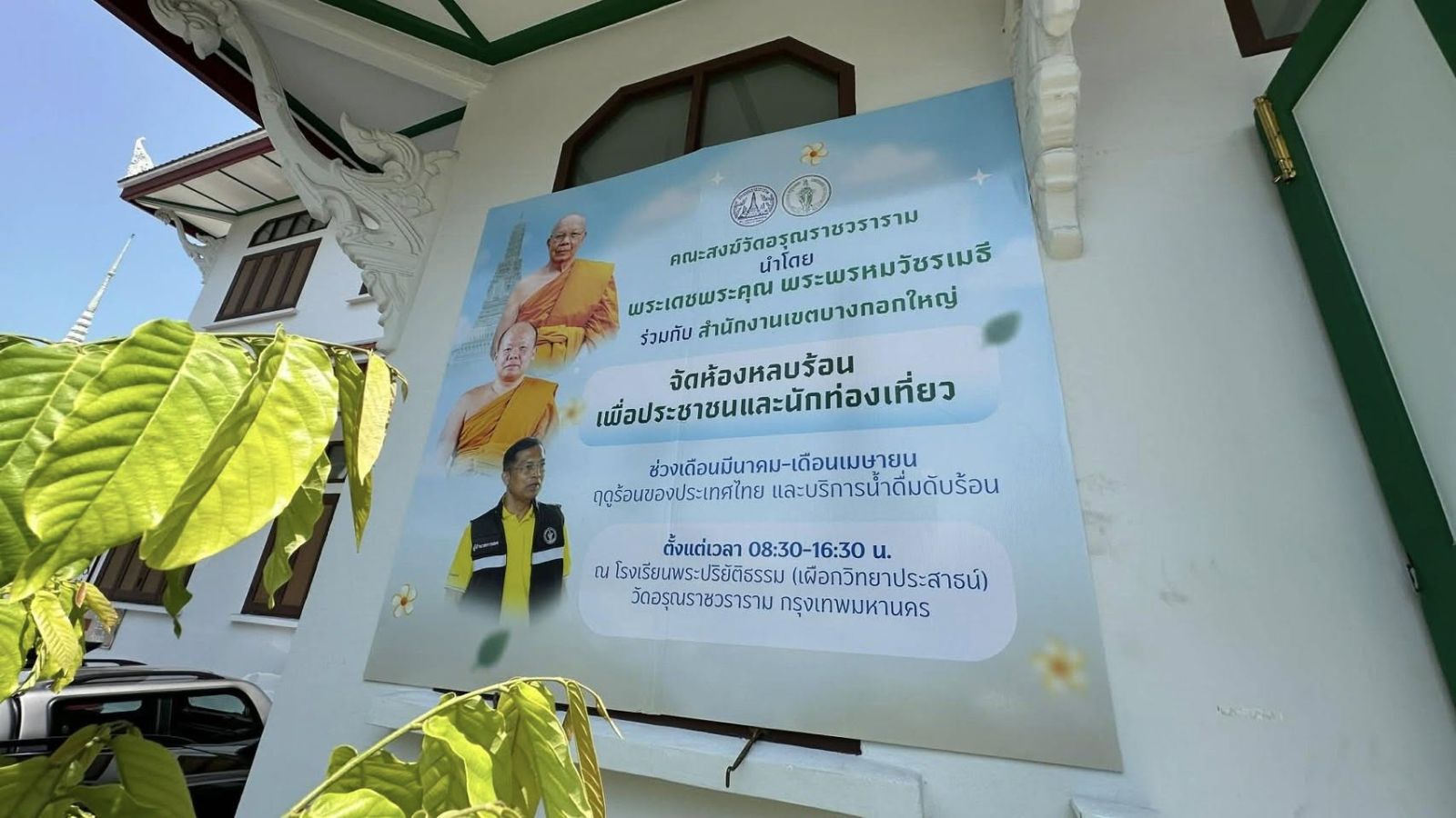 7 เม.ย 69 คณะสงฆ์วัดอรุณราชวราราม นำโดย พระเดชพระคุณ พระพรหมวัชรเมธี กรรมการมหาเถรสมาคม, ที่ปรึกษาเจ้าคณะภาค ๙, เจ้าอาวาสวัดอรุณราชวราราม ร่วมกับ สำนักงานเขตบางกอกใหญ่ นำโดย นายเกียรติวิสุทธิ์ เพ็ชรหมื่นไวย เปิด “ห้องหลบร้อน” เพื่ออำนวยความสะดวกแก่สาธุชนและนักท่องเที่ยว ให้ได้เข้าพักผ่อนคลายความร้อนจากสภาพอากาศ พร้อมจัดเตรียมน้ำดื่มไว้บริการโดยไม่เสียค่าใช้จ่าย
