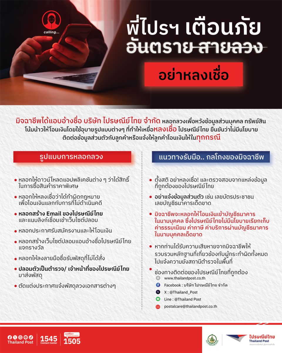 ไปรษณีย์ไทยในฐานะ Trusted Logistics Partner เพื่อนคู่คิดด้านการขนส่งที่คนไทยไว้ใจมากว่า 143 ปี ขอย้ำว่าองค์กรไม่มีนโยบายเรียกเก็บค่าธรรมเนียม ค่าภาษี ค่าบริการผ่านบัญชีธนาคารในนามบุคคลไม่ว่าจะเป็นกรณีใดก็ตาม รวมถึงไม่มีการติดต่อเพื่อขอข้อมูลส่วนตัว หรือส่งลิงก์ให้กรอกข้อมูลผ่านช่องทางที่ไม่เป็นทางการ ทั้งนี้ ไปรษณีย์ไทยมีช่องทางที่พี่ไปรฯ ใช้ติดต่อกับผู้รับพัสดุโดยตรงคือเบอร์โทร. 1505 เพื่อโทรนัดหมายเข้าไปนำจ่าย หรือการแจ้งรายละเอียดเพิ่มเติมเกี่ยวกับสิ่งของที่กำลังจัดส่งเท่านั้น มั่นใจได้เลยว่าเบอร์พี่ไปรฯ รับสายได้ ปลอดภัยชัวร์