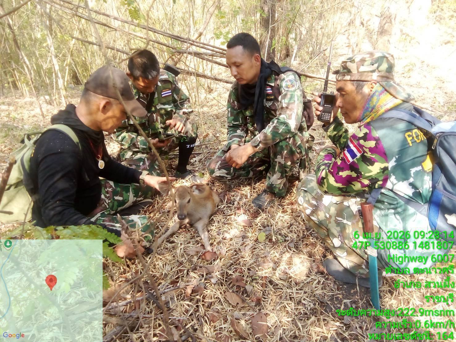 เมื่อเวลาประมาณ 06.00 น. ของวันที่ 6 เมษายน 2569 เจ้าหน้าที่ชุดลาดตระเวนป้องกันไฟป่าสังเกตเห็นกลุ่มควันไฟลอยขึ้นจากพื้นที่ป่าลึก จึงตัดสินใจเดินเท้าเข้าสำรวจพื้นที่ทันที เนื่องจากสภาพภูมิประเทศไม่สามารถใช้ยานพาหนะเข้าถึงได้ กระทั่งเวลา 08.00 น. ทีมจึงเดินทางถึงจุดเกิดเหตุและพบว่ามีไฟป่าลุกลามอยู่จริง ระหว่างปฏิบัติการดับไฟ เจ้าหน้าที่สังเกตเห็นลูกกวางอายุประมาณ 2 สัปดาห์ หมอบนิ่งอยู่ใต้กอไผ่กลางวงล้อมเปลวไฟ มีอาการอ่อนเพลีย ตัวสั่น และสำลักควัน เจ้าหน้าที่จึงเร่งระดมกำลังดับไฟบริเวณโดยรอบโดยเร็วที่สุด เพื่อเปิดทางเข้าช่วยเหลือสัตว์น้อย