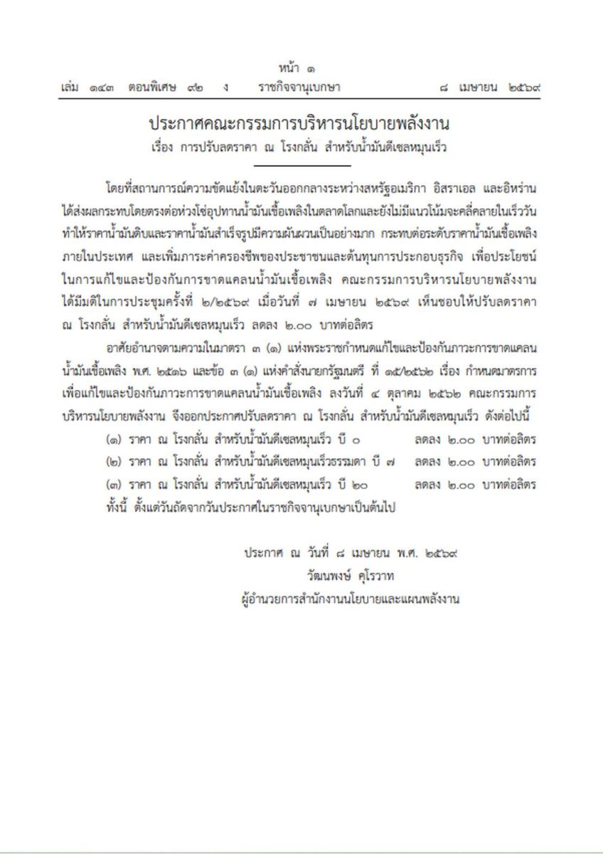โดยที่สถานการณ์ความขัดแย้งในตะวันออกกลางระหว่างสหรัฐอเมริกา อิสราเอล และอิหร่านได้ส่งผลกระทบโดยตรงต่อห่วงโซ่อุปทานน้ำมันเชื้อเพลิงในตลาดโลกและยังไม่มีแนวโน้มจะคลี่คลายในเร็ววัน ทำให้ราคาน้ำมันดิบและราคาน้ำมันสำเร็จรูปมีความผันผวนเป็นอย่างมาก กระทบต่อระดับราคาน้ำมันเชื้อเพลิงภายในประเทศ และเพิ่มภาระค่าครองชีพของประชาชนและต้นทุนการประกอบธุรกิจ เพื่อประโยชน์ในการแก้ไขและป้องกันการขาดแคลนน้ำมันเชื้อเพลิง คณะกรรมการบริหารนโยบายพลังงาน ได้มีมติในการประชุมครั้งที่ 2/2569 เมื่อวันที่ 7 เมษายน 2569 เห็นชอบให้ปรับลดราคา ณ โรงกลั่น สำหรับน้ำมันดีเซลหมุนเร็ว ลดลง 2.00 บาทต่อลิตร อาศัยอำนาจตามความในมาตรา 3 (1) แห่งพระราชกำหนดแก้ไขและป้องกันภาวะการขาดแคลนน้ำมันเชื้อเพลิง พ.ศ. 2516 และข้อ 3 (1) แห่งคำสั่งนายกรัฐมนตรี ที่ 15/2562 เรื่อง กำหนดมาตรการเพื่อแก้ไขและป้องกันภาวะการขาดแคลนน้ำมันเชื้อเพลิง ลงวันที่ 4 ตุลาคม 2562 คณะกรรมการบริหารนโยบายพลังงาน จึงออกประกาศปรับลดราคา ณ โรงกลั่น สำหรับน้ำมันดีเซลหมุนเร็ว ดังต่อไปนี้