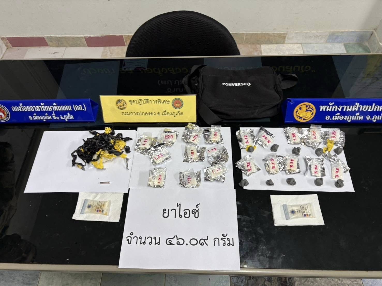 จึงได้ตรวจสอบด้านในพบว่า มีวัตถุกลมพันด้วยเทปดำ และหุ้มด้วยดินน้ำมัน คล้ายห่อยาเสพติดที่แบ่งไว้จำหน่ายจำนวนหลายลูก จึงได้ตรวจยึดนำมาที่ว่าการอำเภอเมืองภูเก็ต จากนั้นใช้ชุดน้ำยาทดสอบสารเสพติด ของสำนักงาน ป.ป.ส. ONCB 051 (Marquis Reagent Test) ผลปรากฎพบว่า คือยาไอซ์ น้ำหนักรวมทั้งสิ้น 46.09 กรัม