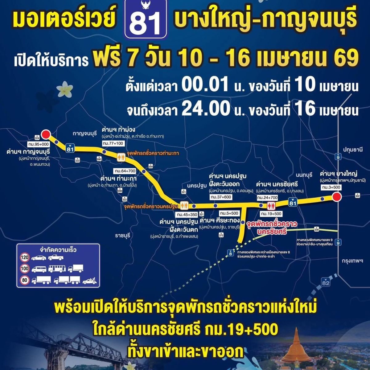 สงกรานต์นี้ ฟรีตลอดสาย! มอเตอร์เวย์ M81 บางใหญ่ – กาญจนบุรี