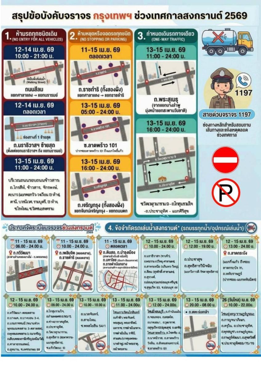 วันนี้ (10 เมษายน 2569) พล.ต.อ.สำราญ นวลมา รองผู้บัญชาการตำรวจแห่งชาติ ผู้อำนวยการศูนย์บริหารงานจราจร สำนักงานตำรวจแห่งชาติ (รอง ผบ.ตร./ผอ.ศจร.ตร.) เปิดเผยว่า ในช่วงเทศกาลสงกรานต์ประจำปี 2569 ซึ่งมีวันหยุดยาวต่อเนื่องและมีประชาชนเดินทางเป็นจำนวนมาก สำนักงานตำรวจแห่งชาติได้ออกข้อบังคับหัวหน้าเจ้าพนักงานจราจร จำนวน 3 ฉบับ เพื่อบริหารจัดการจราจร ป้องกันอุบัติเหตุ และอำนวยความสะดวกในการเดินทางของประชาชน โดยมีมาตรการสำคัญ ได้แก่ การห้ามเดินรถในบางเส้นทางสำคัญ อาทิ ถนนสีลม ถนนข้าวสาร, การห้ามจอดรถในบางพื้นที่, การห้ามรถขับเล่นสาดน้ำและรถเครื่องเสียง รวมถึงการกำหนดช่องทางเดินรถพิเศษ (Reversible Lane) เพื่อเพิ่มประสิทธิภาพการระบายการจราจร