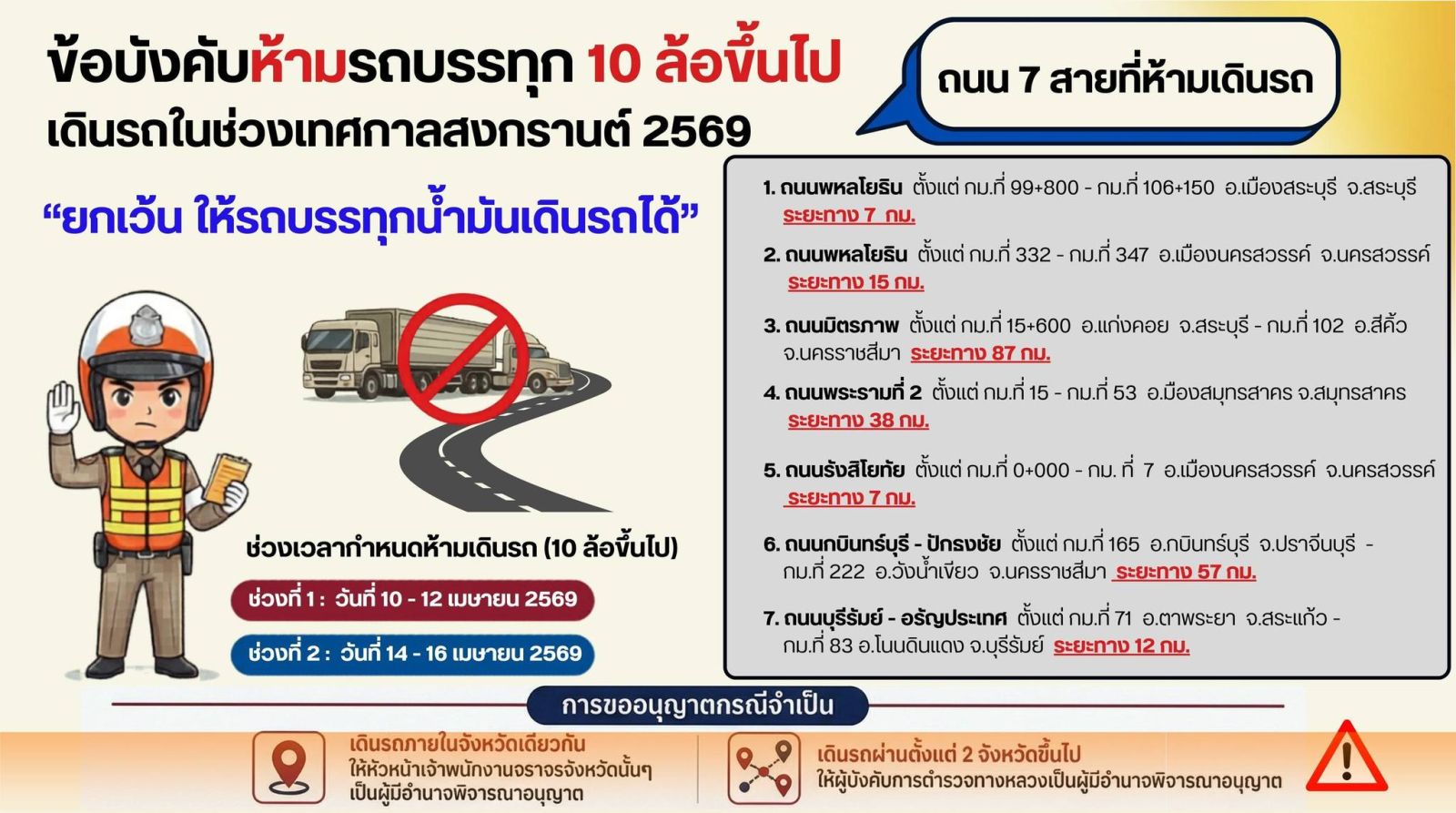 นอกจากนี้ ยังมีมาตรการห้ามรถบรรทุก 10 ล้อขึ้นไป เดินรถในบางเส้นทางช่วงวันที่ 10–12 และ 14–16 เมษายน 2569 เพื่อบรรเทาปัญหาการจราจรหนาแน่น อย่างไรก็ตาม สำนักงานตำรวจแห่งชาติได้ออกข้อบังคับหัวหน้าเจ้าพนักงานจราจรทั่วราชอาณาจักร (ฉบับที่ 2) เพื่อ “ยกเว้นรถบรรทุกน้ำมันเชื้อเพลิง” อนุญาตผ่อนผันให้เดินรถในทุกจังหวัดได้ตลอด 24 ชั่วโมง จนถึงวันที่ 30 เมษายน 2569 เพื่อให้การขนส่งน้ำมันเชื้อเพลิงไปยังสถานีบริการเป็นไปอย่างต่อเนื่อง และไม่เกิดปัญหากับการใช้ยานพาหนะในการเดินทางของพี่น้องประชาชน