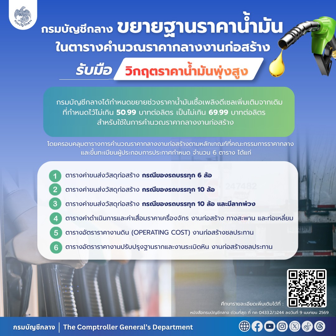วันที่ 10 เมษายน 2569 นางแพตริเซีย มงคลวนิช อธิบดีกรมบัญชีกลาง เปิดเผยว่า กรมบัญชีกลางดำเนินการขยายตารางรายละเอียดประกอบการถอดแบบคำนวณราคากลางงานก่อสร้างในส่วนที่เกี่ยวข้องกับราคาน้ำมันเพื่อให้สอดคล้องกับสถานการณ์ความขัดแย้งในภูมิภาคตะวันออกกลาง ที่มีผลกระทบต่อสถานการณ์น้ำมันดิบในตลาดโลก ทำให้ราคาน้ำมันในประเทศปรับตัวสูงขึ้น ซึ่งส่งผลต่อต้นทุนการดำเนินงานก่อสร้างของภาครัฐโดยตรง