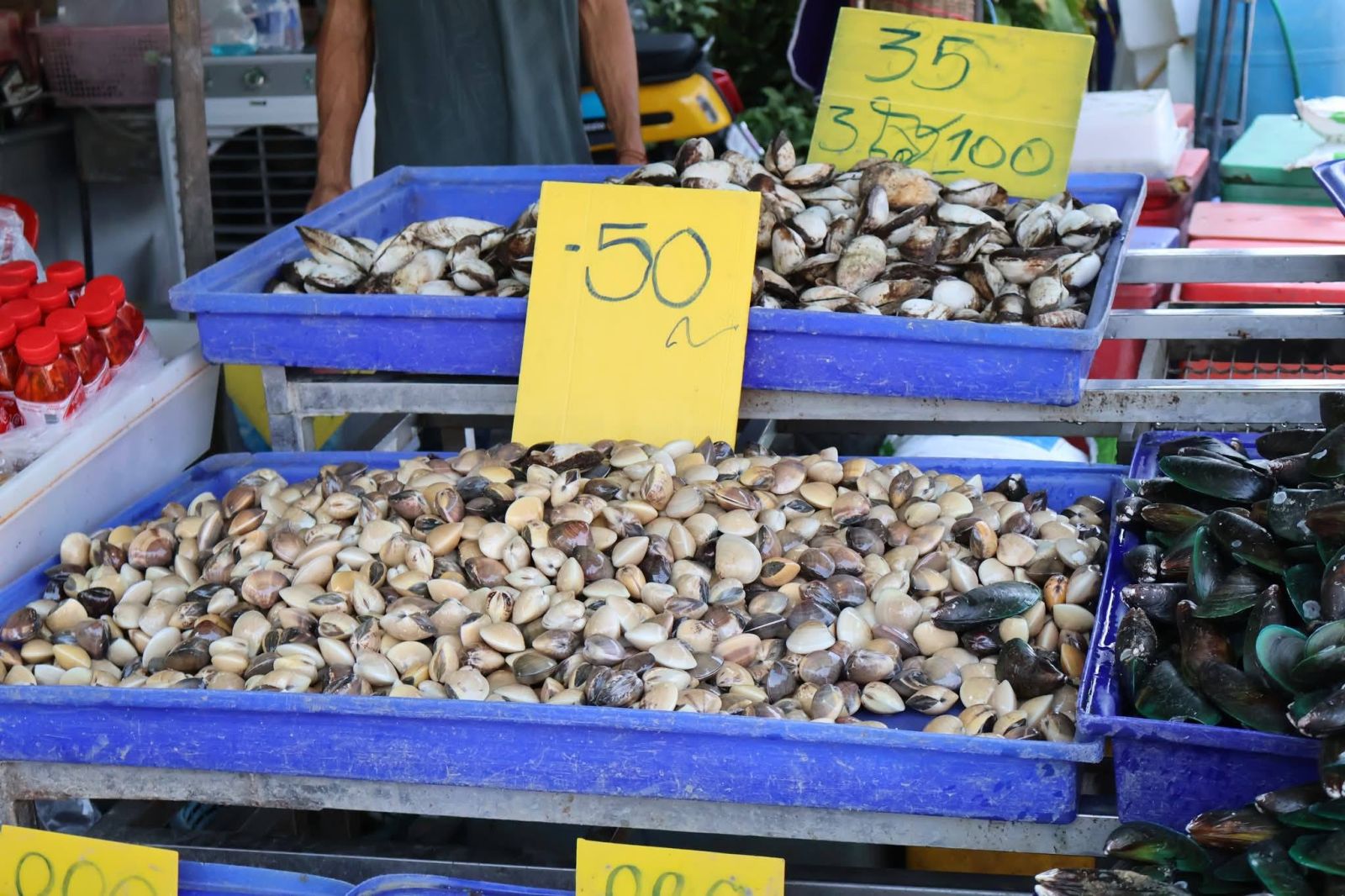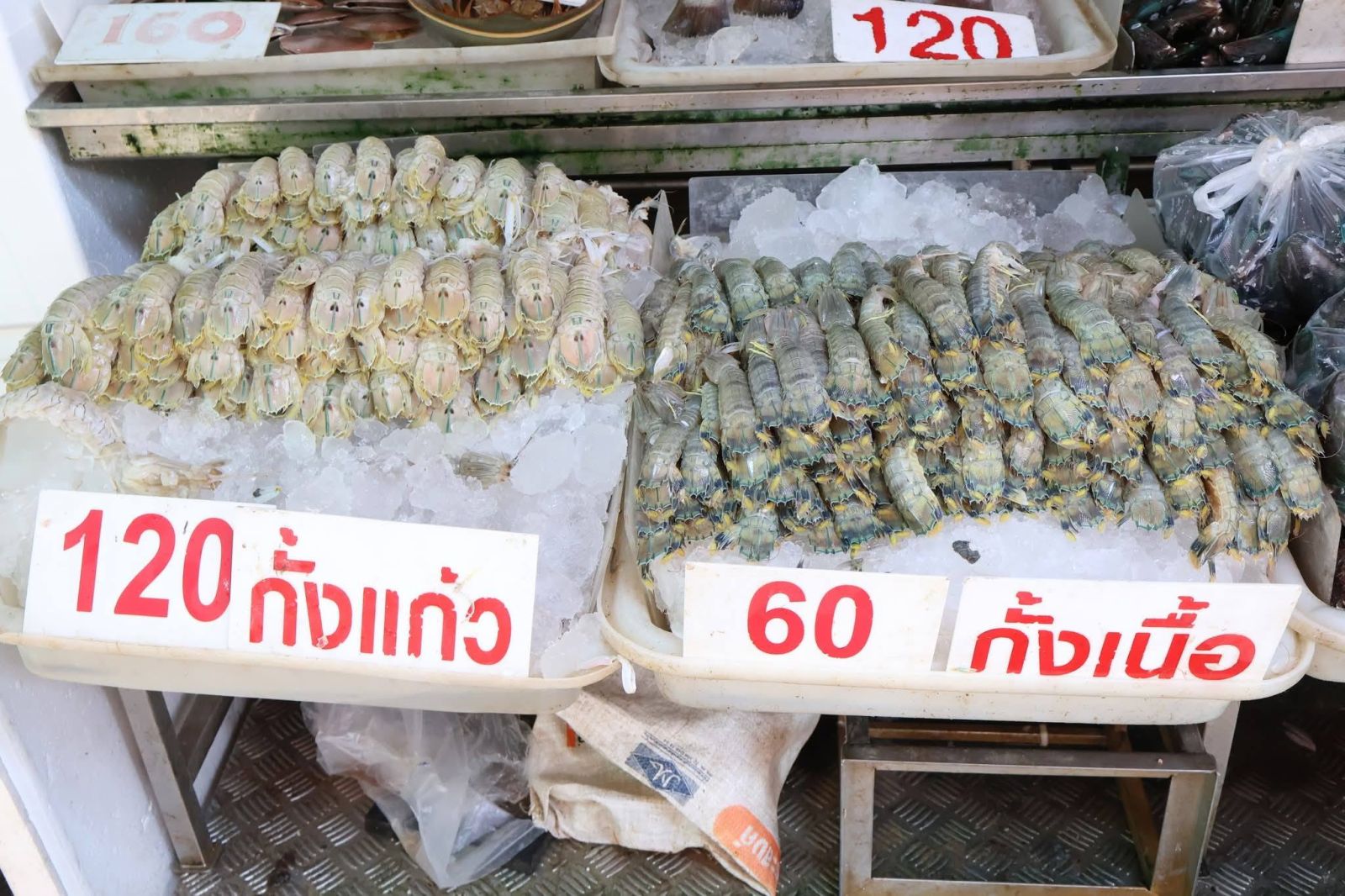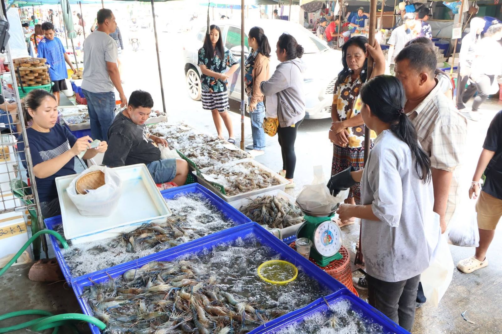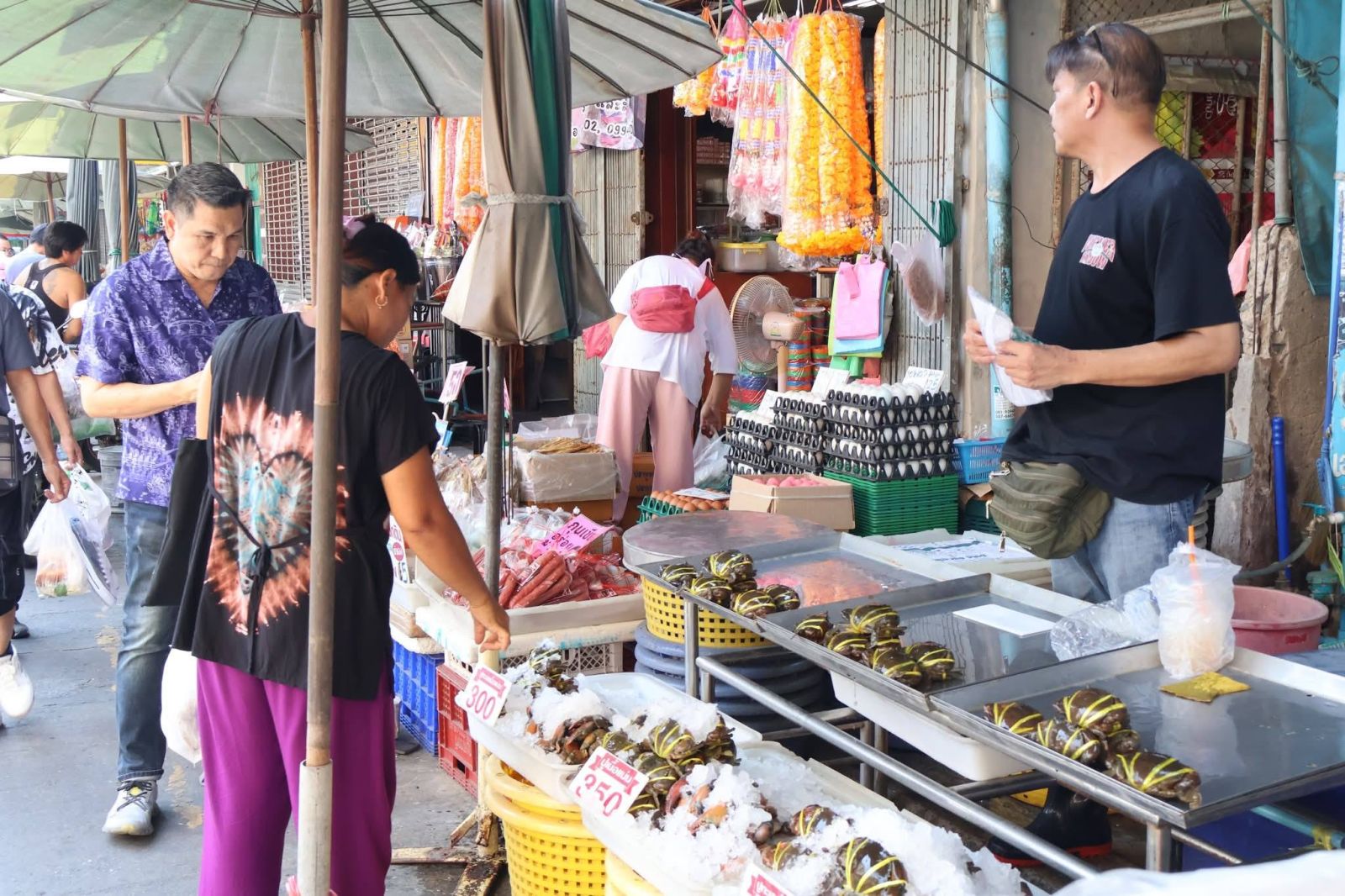 ภายในตลาด พ่อค้าแม่ค้าได้นำอาหารทะเลสดใหม่มาจำหน่ายจำนวนมาก ทั้งกุ้ง หอย ปู ปลา และปลาหมึก จัดเรียงเต็มแผงอย่างสวยงาม ท่ามกลางเสียงเรียกลูกค้า และบรรยากาศการต่อรองราคา ที่สร้างสีสันให้กับตลาด ซึ่งยังคงเป็นแหล่งจำหน่ายอาหารทะเลสำคัญของจังหวัดสมุทรสาคร