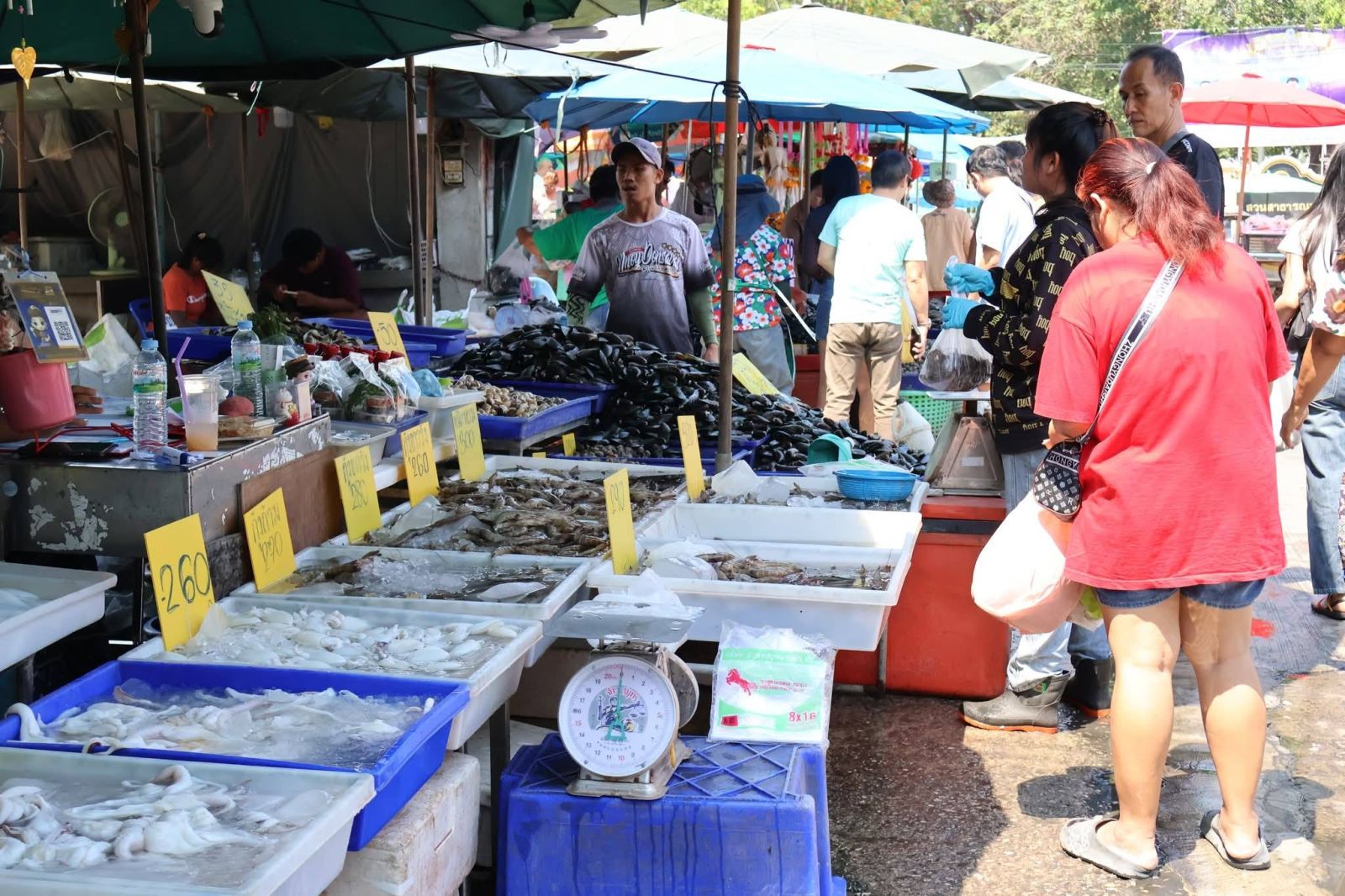 วันที่ 12 เมษายน 2569 เพจสํานักงานประชาสัมพันธ์จังหวัดสมุทรสาคร เปิดเผยบรรยากาศการจำหน่ายอาหารทะเลที่ตลาดมหาชัย จังหวัดสมุทรสาคร ในช่วงเช้าของวันนี้ (12 เมษายน 2569) ยังคงคึกคัก โดยเฉพาะช่วงเช้า มีพี่น้องประชาชน นักท่องเที่ยว และพ่อค้าแม่ค้า เดินทางมาเลือกซื้ออาหารทะเลสดกันอย่างต่อเนื่อง