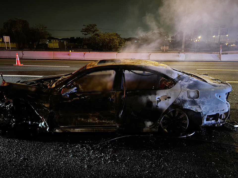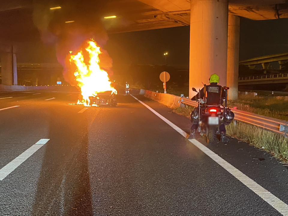 เพลิงไหม้รถยนต์ กลางถนนมอเตอร์เวย์ (ทล.7) ช่วงใต้ต่างระดับทับช้าง เสียหายวอดทั้งคัน