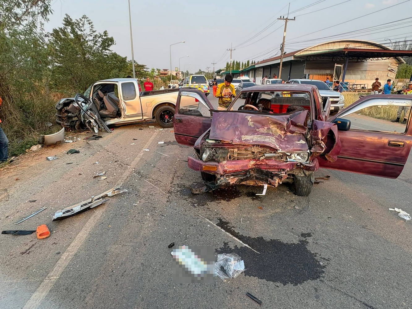 ที่เกิดเหตุ พบรถกระบะ โตโยต้า สีแดง ป้ายทะเบียน อุดรธานี สภาพหน้ารถพังเสียหาย ใกล้กัน พบรถกระบะ อีซูซุ ดีแม็กซ์ สีเทา สภาพหน้ารถพังเสียหายเช่นกัน