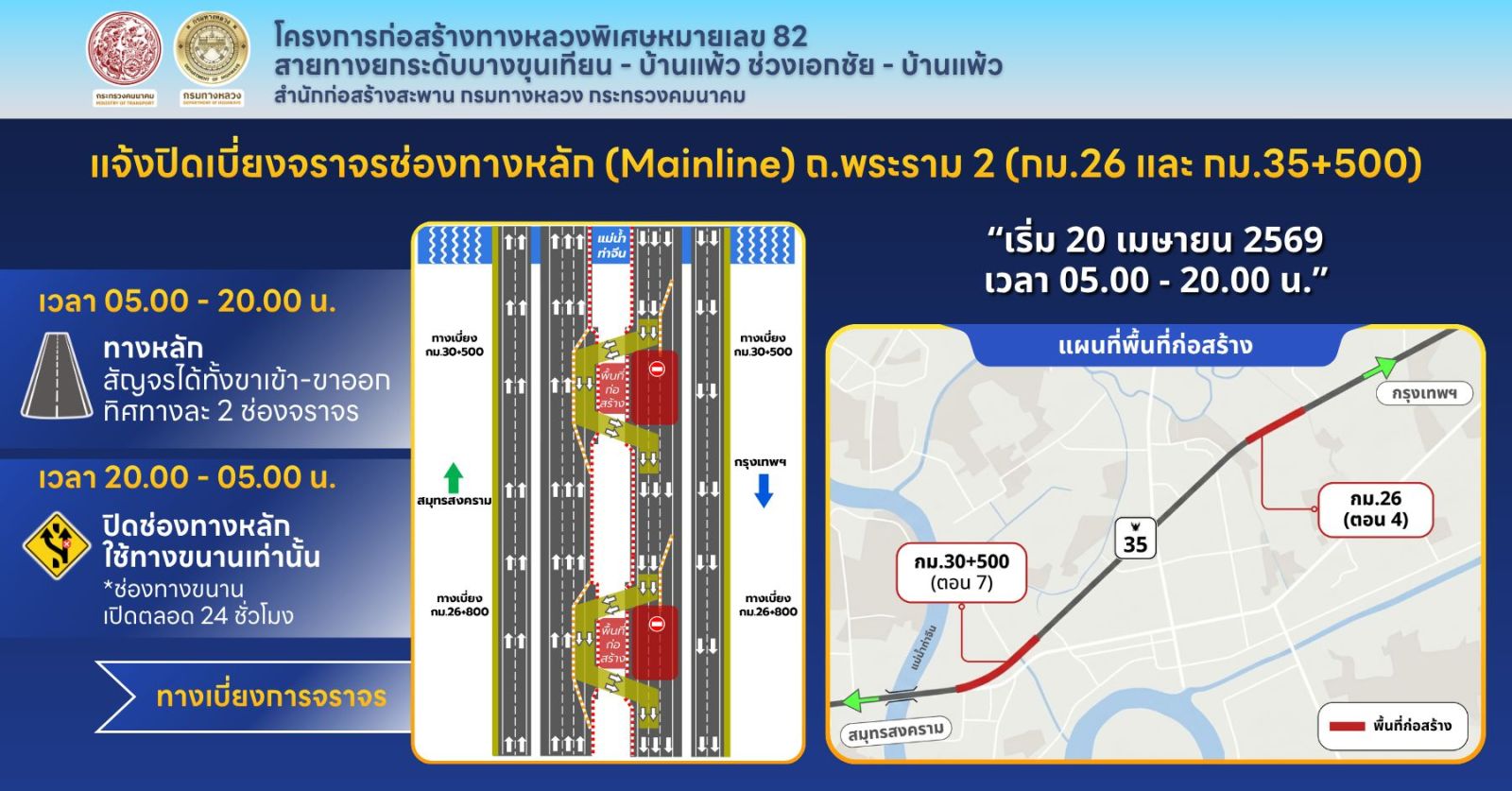 วันนี้ (17 เมษายน 2569) กรมทางหลวง โดยสำนักก่อสร้างสะพาน ขอประชาสัมพันธ์ให้ประชาชนผู้ใช้เส้นทางบนทางหลวงหมายเลข 35 (ถนนพระราม 2 ) ทราบว่า ภายหลังสิ้นสุดเทศกาลสงกรานต์ กรมทางหลวงจะดำเนินการปิดเบี่ยงการจราจรในช่องทางหลักบางจุดอีกครั้ง เพื่อเข้าดำเนินการยกติดตั้งชิ้นส่วนโครงสร้างทางยกระดับโครงการทางหลวงพิเศษระหว่างเมืองหมายเลข 82 (M82) สายทางยกระดับบางขุนเทียน–บ้านแพ้ว (ตอน 4 และตอน 7) ตามแผนงาน