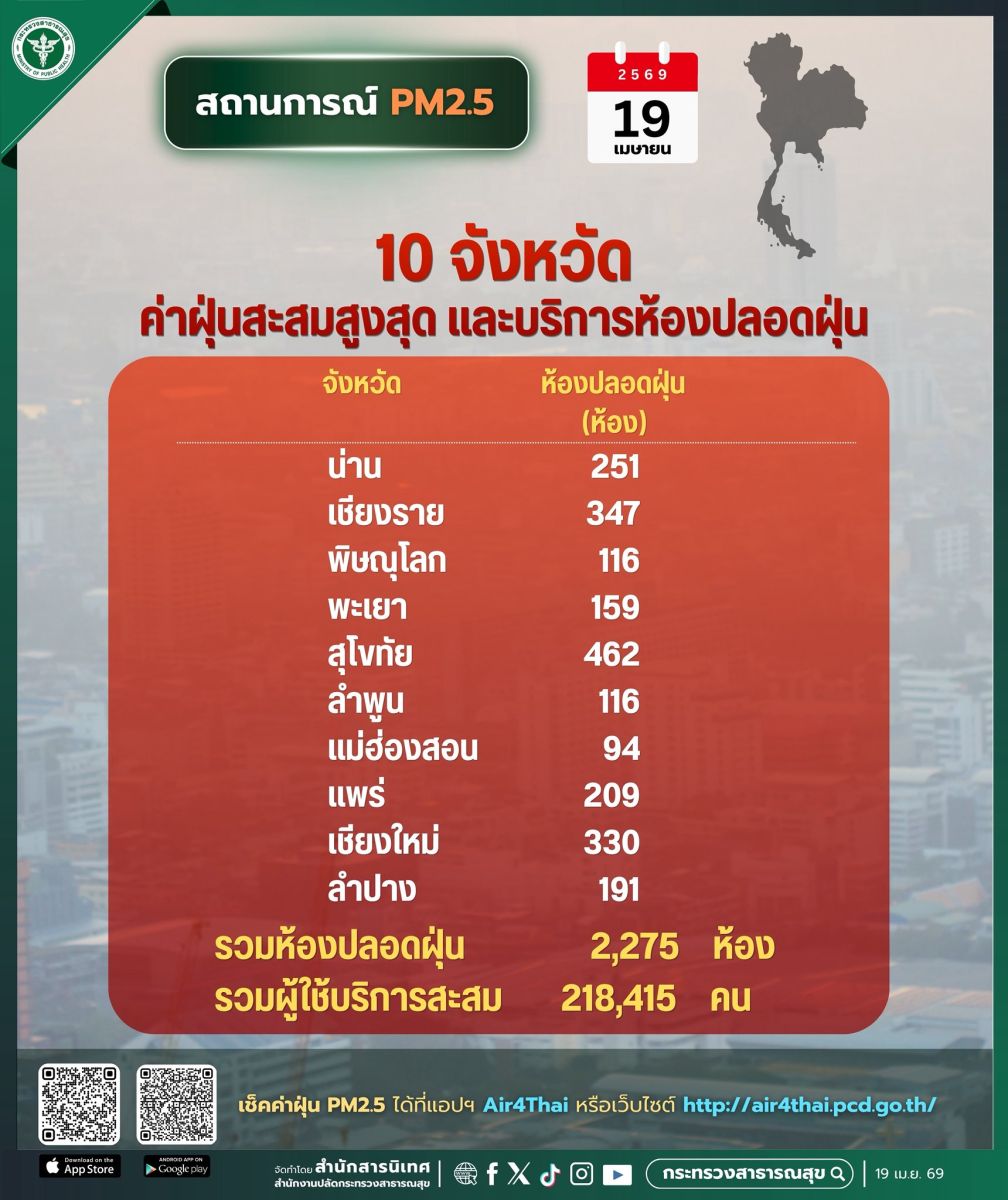 (19 เมษายน 2569) นพ.เอกชัย เพียรศรีวัชรา รองปลัดกระทรวงสาธารณสุขและโฆษกกระทรวงสาธารณสุข กล่าวถึงการดูแลสุขภาพประชาชนในสถานการณ์ฝุ่น PM 2.5 ที่ยังคงสูงอย่างต่อเนื่อง ว่า นายพัฒนา พร้อมพัฒน์ รัฐมนตรีว่าการกระทรวงสาธารณสุข และ นพ.สมฤกษ์ จึงสมาน ปลัดกระทรวงสาธารณสุข ได้มอบนโยบายและติดตามการทำงานด้านสาธารณสุขทุกพื้นที่อย่างต่อเนื่อง เพื่อดูแลสุขภาพประชาชนจากฝุ่น PM 2.5 โดยให้ตั้งศูนย์ปฏิบัติการฉุกเฉินด้านการแพทย์และสาธารณสุข (PHEOC) กรณีฝุ่น PM 2.5 เพื่อติดตามสถานการณ์คุณภาพอากาศ และใช้เป็นข้อมูลในการแจ้งเตือนและดูแลสุขภาพประชาชนได้ทันทีในพื้นที่ที่มีค่าฝุ่นสูงและพื้นที่ที่มีแนวโน้มค่าฝุ่นจะสูงขึ้นจนถึงระดับเริ่มส่งผลกระทบต่อสุขภาพ โดยเฉพาะภาคเหนือที่มีค่าฝุ่นเกินมาตรฐานอย่างต่อเนื่อง รวมถึงมีการเฝ้าระวัง 4 กลุ่มโรคสำคัญ เพื่อติดตามผลกระทบในระยะยาว ซึ่งข้อมูลวันที่ 19 เมษายน 2569 พบว่า 10 จังหวัดที่มีค่าฝุ่น PM 2.5 สะสมสูงสุด ได้แก่ น่าน 210.9 ไมโครกรัมต่อลูกบาศก์เมตร (มคก./ลบ.ม.) เชียงราย 152.9 มคก./ลบ.ม. พิษณุโลก 129.9 มคก./ลบ.ม. พะเยา 129.2 มคก./ลบ.ม. สุโขทัย 113.0 มคก./ลบ.ม. ลำพูน 109.0 มคก./ลบ.ม. แม่ฮ่องสอน 108.0 มคก./ลบ.ม. แพร่ 99.9 มคก./ลบ.ม. เชียงใหม่ 99.1 มคก./ลบ.ม. และลำปาง 98.4 มคก./ลบ.ม.