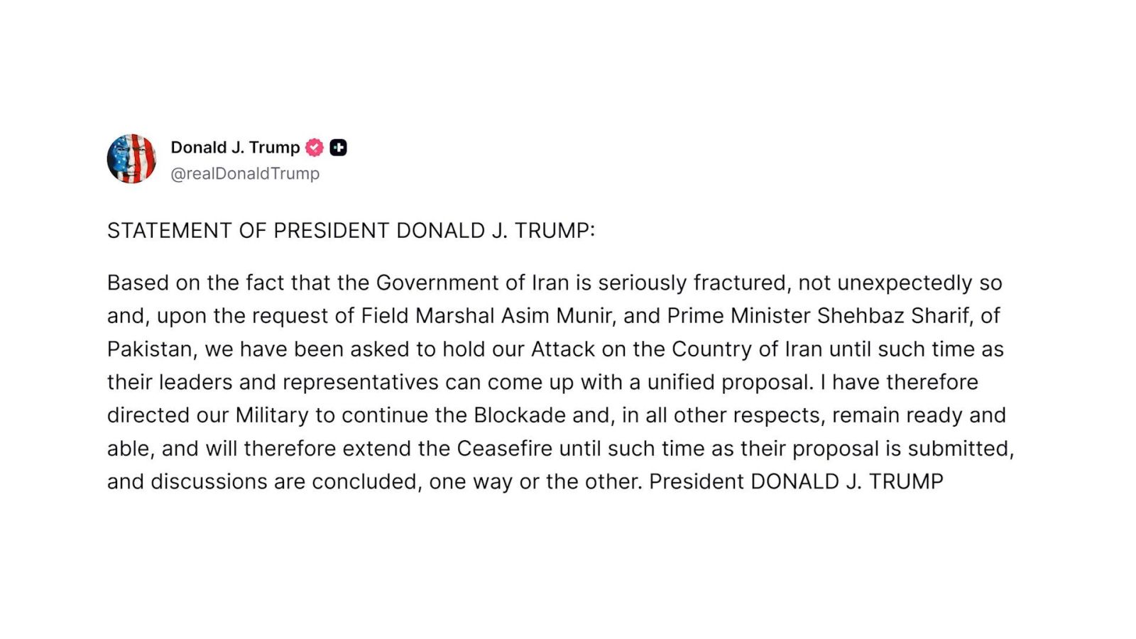 วอชิงตัน, 22 เม.ย. ซินหัว รายงานว่า — เมื่อวันอังคาร (21 เม.ย.) โดนัลด์ ทรัมป์ ประธานาธิบดีสหรัฐฯ โพสต์บนทรูธ โซเชียล (Truth Social) ว่าจะขยายระยะเวลาหยุดยิงกับอิหร่านจนกว่าคณะผู้นำและผู้แทนของอิหร่านจะยื่นข้อเสนอที่เป็นเอกภาพหรือเสร็จสิ้นการหารือที่เกี่ยวข้อง ซึ่งการขยายระยะเวลาหยุดยิงนี้เป็นไปตามข้อเท็จจริงที่ว่ารัฐบาลอิหร่านแตกแยกอย่างหนัก รวมถึงตามคำร้องขอจากอาซิม มูนีร์ ผู้บัญชาการกองทัพปากีสถาน และเชห์บาซ ชารีฟ นายกรัฐมนตรีปากีสถาน ทว่ากองทัพสหรัฐฯ จะยังคงปิดล้อมทางทะเลและยังคงพร้อมปฏิบัติการอยู่เสมอ
