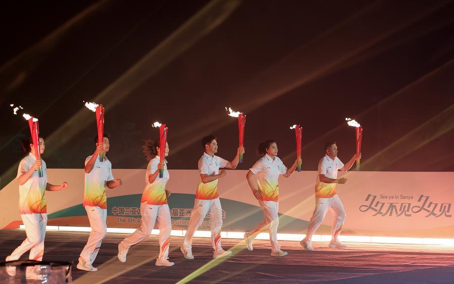 ขณะเดียวกัน พิธีจุดคบเพลิงมีการออกแบบที่โดดเด่น โดยผู้ถือคบเพลิง 6 คนเดินเข้ามาจากทั้งสองด้านของเวทีรูป "วงแหวนแห่งแสงอาทิตย์" จับมือกันจุดไฟ ก่อนที่เวทีจะเปลี่ยนเป็นกระถางคบเพลิงและมีเปลวไฟลุกโชนส่องสว่าง ส่วนพิธีเปิดปิดท้ายด้วยเพลงซียา อิน ซานย่า (See ya in Sanya) ขับร้องโดยอาสาสมัคร 20 คนของการแข่งขันฯ