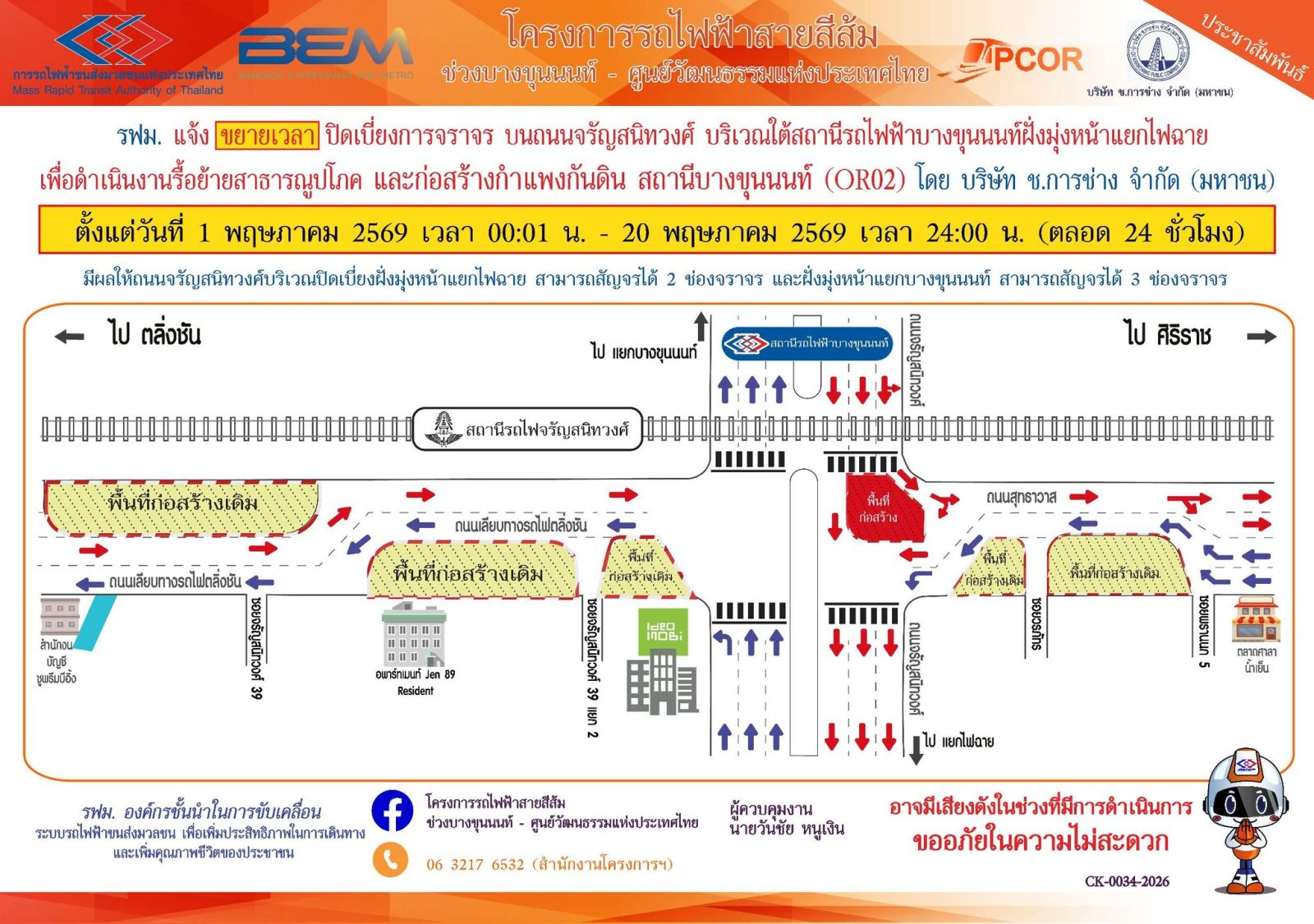 การรถไฟฟ้าขนส่งมวลชนแห่งประเทศไทย (รฟม.) แจ้งว่า บริษัท ช.การช่าง จำกัด (มหาชน) ผู้รับจ้างออกแบบและก่อสร้างอุโมงค์ทางวิ่งและสถานีใต้ดิน โครงการรถไฟฟ้าสายสีส้ม ช่วงบางขุนนนท์ – ศูนย์วัฒนธรรมแห่งประเทศไทย มีความจำเป็นต้องขยายเวลาปิดเบี่ยงการจราจร 2 ช่องจราจร บนถนนจรัญสนิทวงศ์ บริเวณใต้สถานีรถไฟฟ้าบางขุนนนท์ฝั่งมุ่งหน้าแยกไฟฉายเพื่อดำเนินงานรื้อย้ายสาธารณูปโภค และก่อสร้างกำแพงกันดิน สถานีบางขุนนนท์ (OR02) ตั้งแต่วันที่ 1 พฤษภาคม 2569 เวลา 00:01 น. – 20 พฤษภาคม 2569 เวลา 24:00 น. (ตลอด 24 ชั่วโมง) มีผลให้ถนนจรัญสนิทวงศ์บริเวณปิดเบี่ยงฝั่งมุ่งหน้าแยกไฟฉาย สามารถสัญจรได้ 2 ช่องจราจร และฝั่งมุ่งหน้าแยกบางขุนนนท์ สามารถสัญจรได้ 3 ช่องจราจร โดยประชาชนสามารถเข้า – ออกที่พักอาศัยได้ตามปกติ