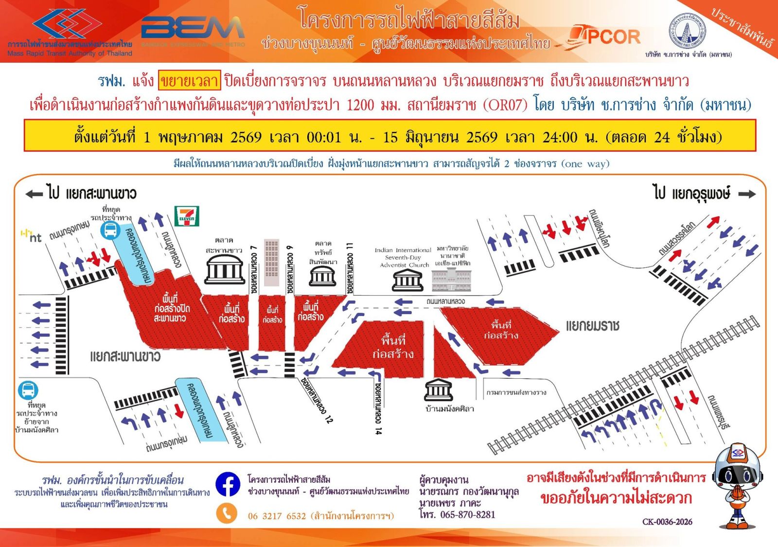 รฟม. แจ้งขยายเวลาปิดเบี่ยงการจราจร บนถนนหลานหลวง บริเวณแยกยมราช ถึงบริเวณแยกสะพานขาว เพื่อดำเนินงานก่อสร้างกำแพงกันดินและขุดวางท่อประปา 1200 มม. สถานียมราช (OR07) โครงการรถไฟฟ้าสายสีส้ม ช่วงบางขุนนนท์ - ศูนย์วัฒนธรรมแห่งประเทศไทย ตั้งแต่วันที่ 1 พฤษภาคม 2569 เวลา 00:01 น. – 15 มิถุนายน 2569 เวลา 24:00 น. (ตลอด 24 ชั่วโมง)