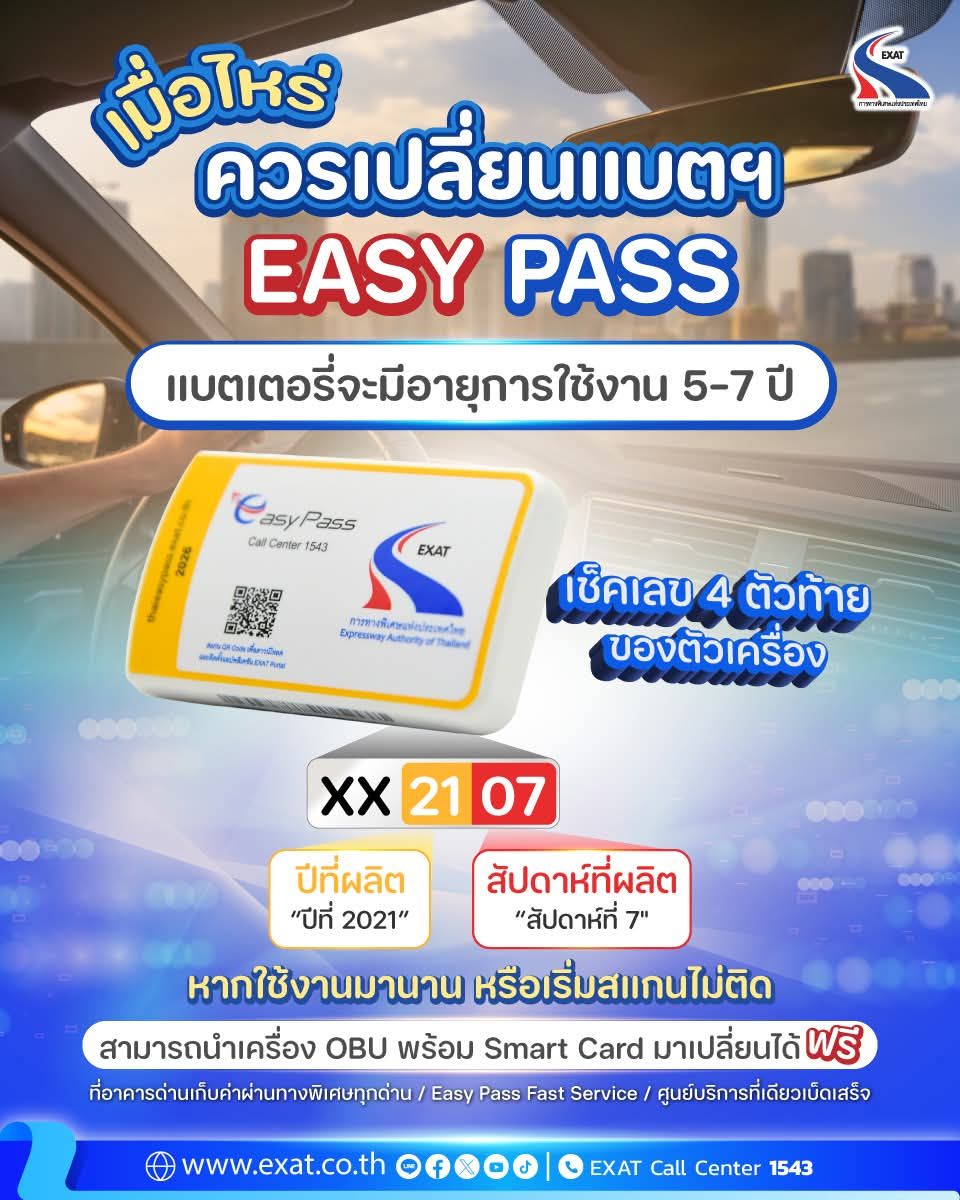 กทพ.เเนะ "แบตเตอรี่ของ Easy Pass" ใช้ได้นานแค่ไหน ควรเปลี่ยนแบตเตอรี่เมื่อไหร่?