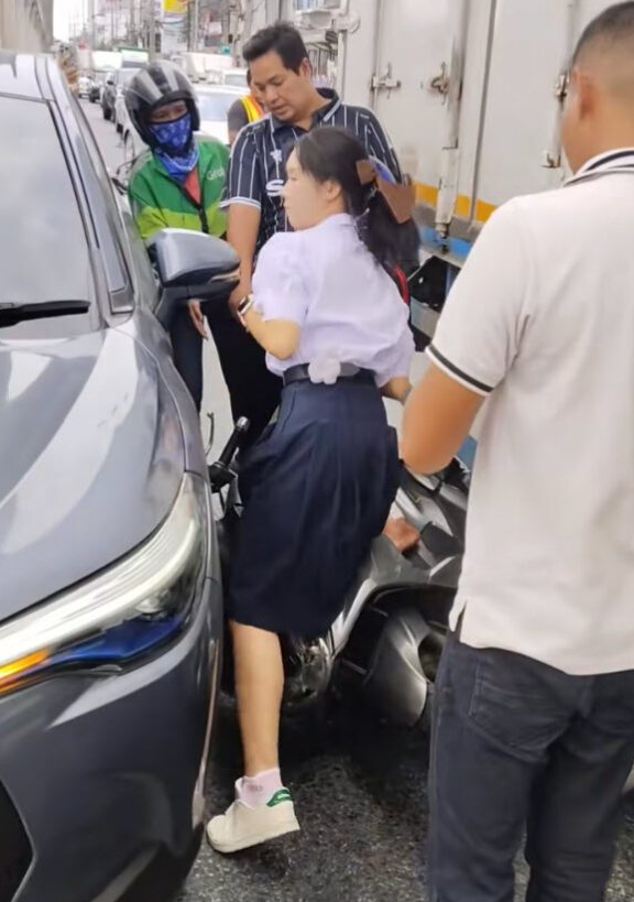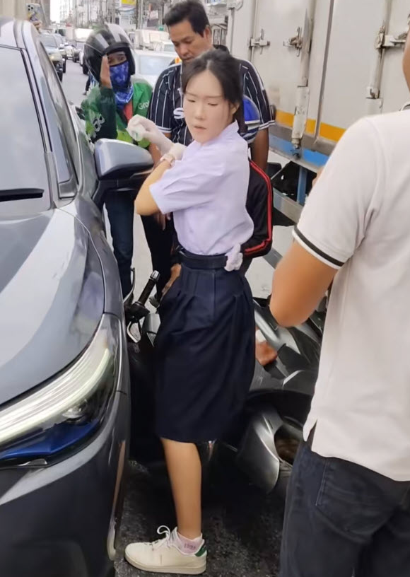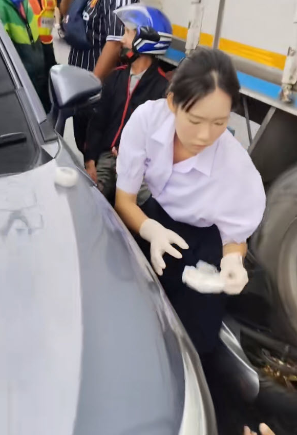 โดยโซเชียลแห่ชื่นชมภาพเหตุการณ์บนถนนสุขุมวิท สมุทรปราการ เมื่อเด็กนัสาวคนหนึ่งสวมชุดนักเรียนหญิง กำลังช่วยเหลือผู้ได้รับบาดเจ็บ โดยเพจ “พี่เบียร์ไรเดอร์กู้ภัย” เล่าไว้ว่า... เช้าวันนั้นทุกคนกำลังเร่งรีบ ทั้งไปเรียน ไปทำงาน แต่แล้วก็เกิดเหตุไม่คาดฝัน มอเตอร์ไซค์ประสานงารถยนต์กลางถนน ร่างคุณลุงคนขับนอนเจ็บอยู่ข้างรถขนของ