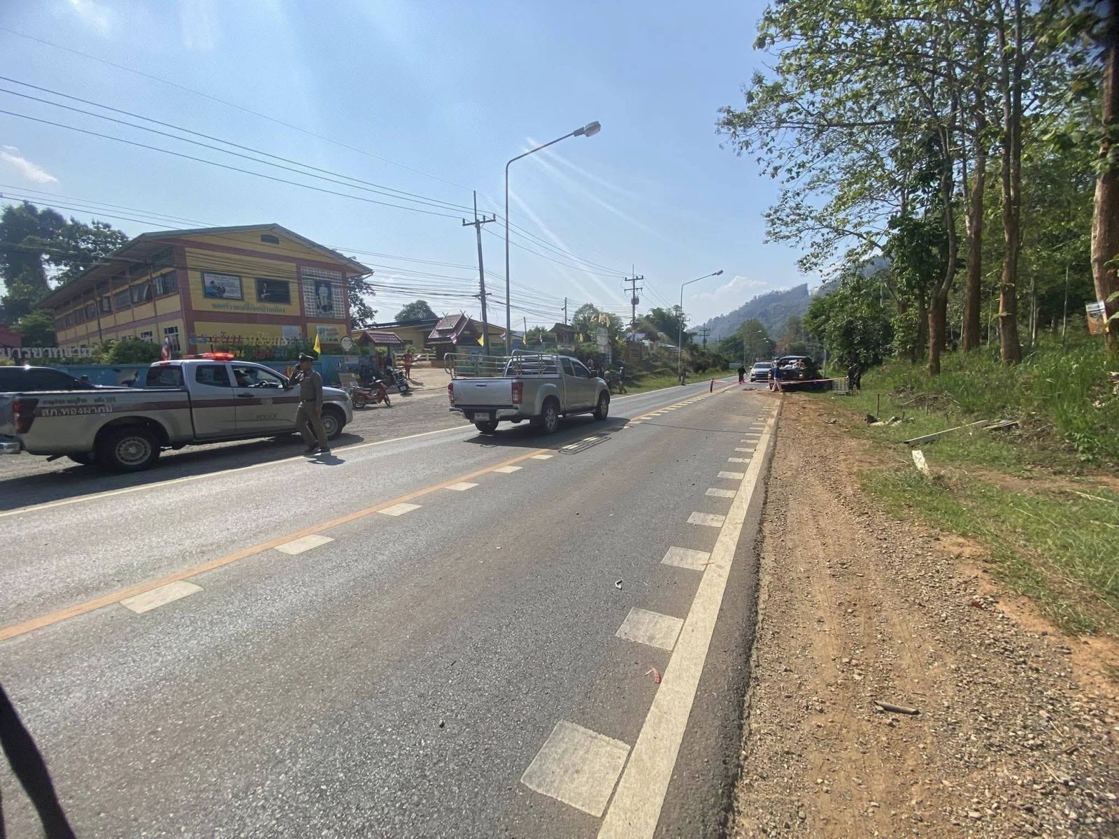 ที่เกิดเหตุ พบรถยนต์กระบะ โตโยต้า วีโก้ สีดำ สภาพด้านหน้าพังเสียหายจากการชนอย่างแรง ตรวจสอบบริเวณใต้ท้องรถ พบว่ามีร่างผู้บาดเจ็บ 1 ราย ทราบต่อมา เป็นชายไทย อายุประมาณ 65 ปี  อดีตผู้ช่วยผู้ใหญ่บ้านหมู่ 2 นอนแน่นิ่งไม่รู้สึกตัว สภาพถูกรถกระบะทับติดอยู่กับซากรถจักรยานยนต์พ่วงข้าง (ซาเล้ง) ที่พังยับเยินอยู่ใต้ตัวรถ